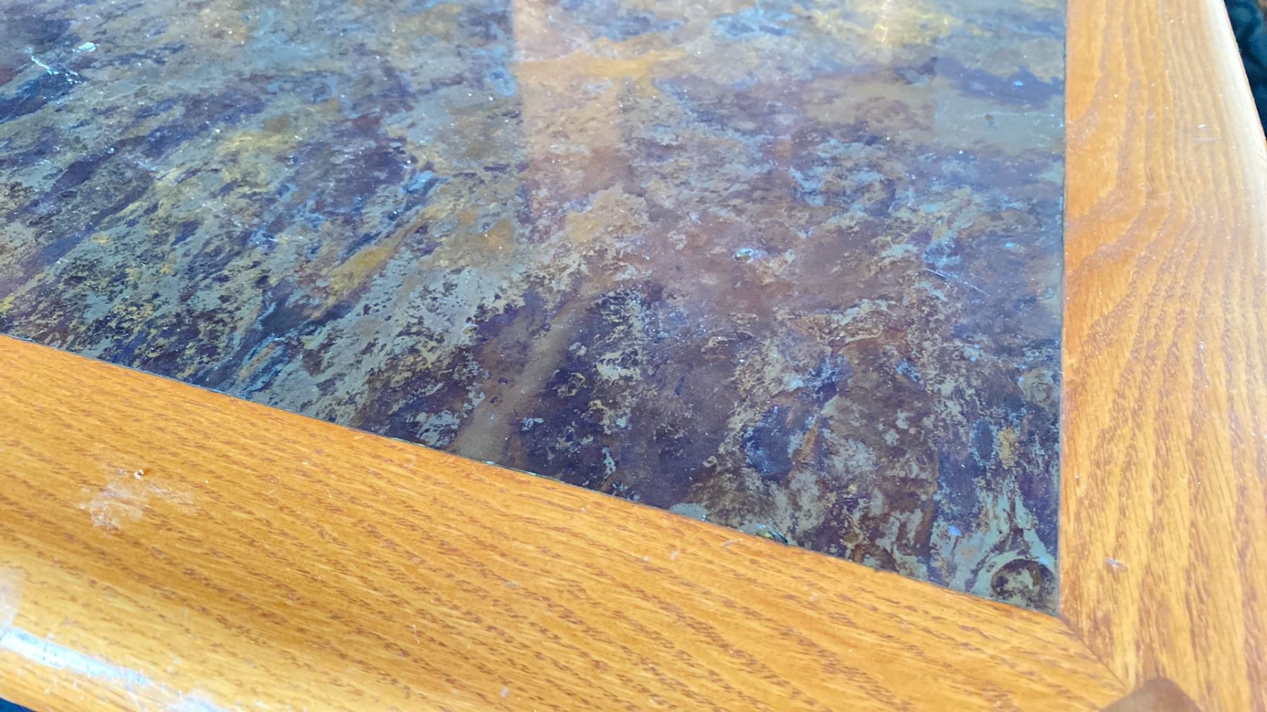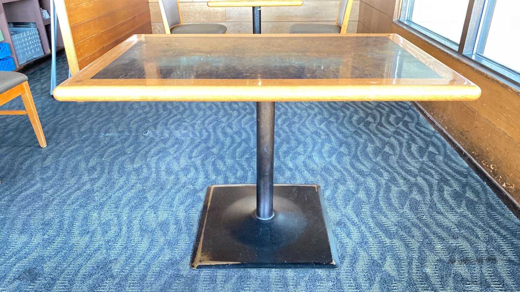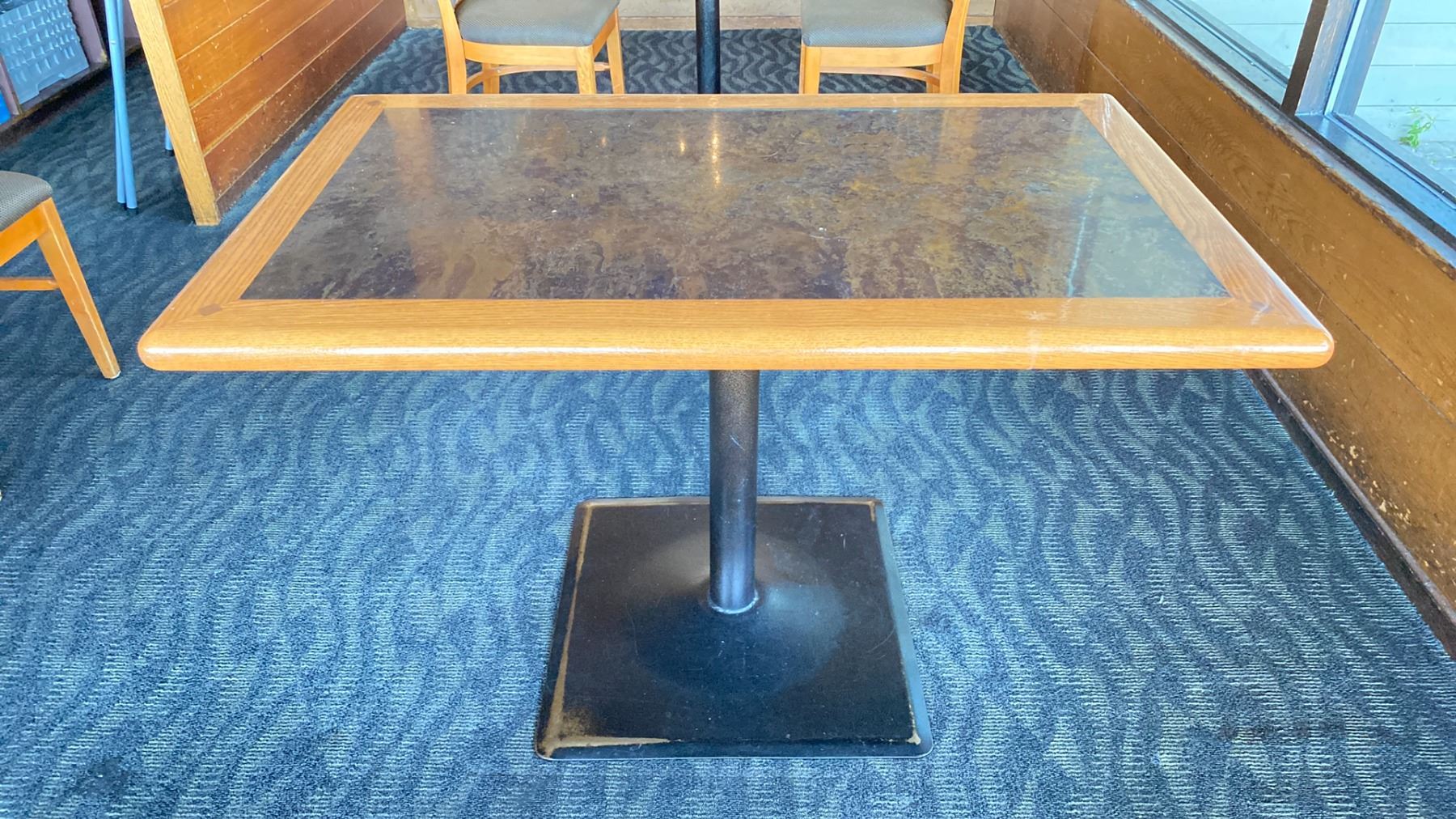 OAK TABLE WITH TWO TONE TOP BLACK METAL PEDESTAL APPROX 45" L X 28" W X 29"H
