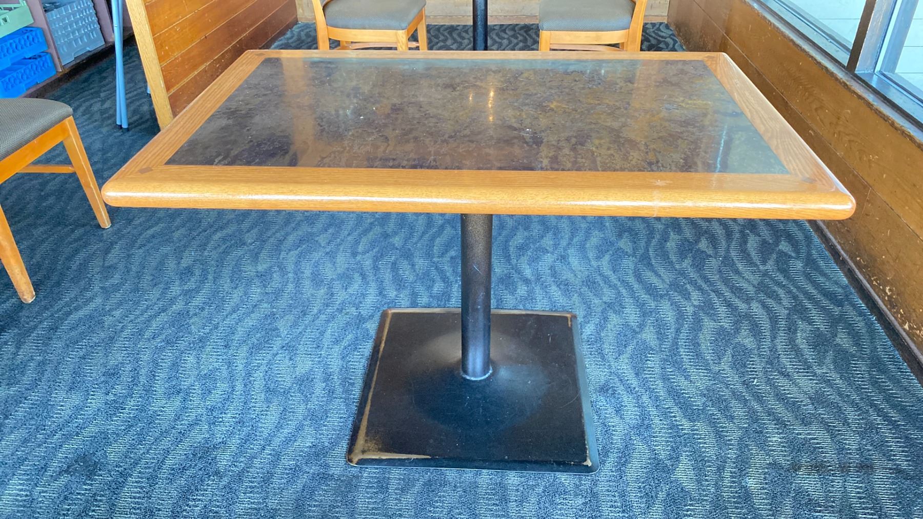 OAK TABLE WITH TWO TONE TOP BLACK METAL PEDESTAL APPROX 45" L X 28" W X 29"H