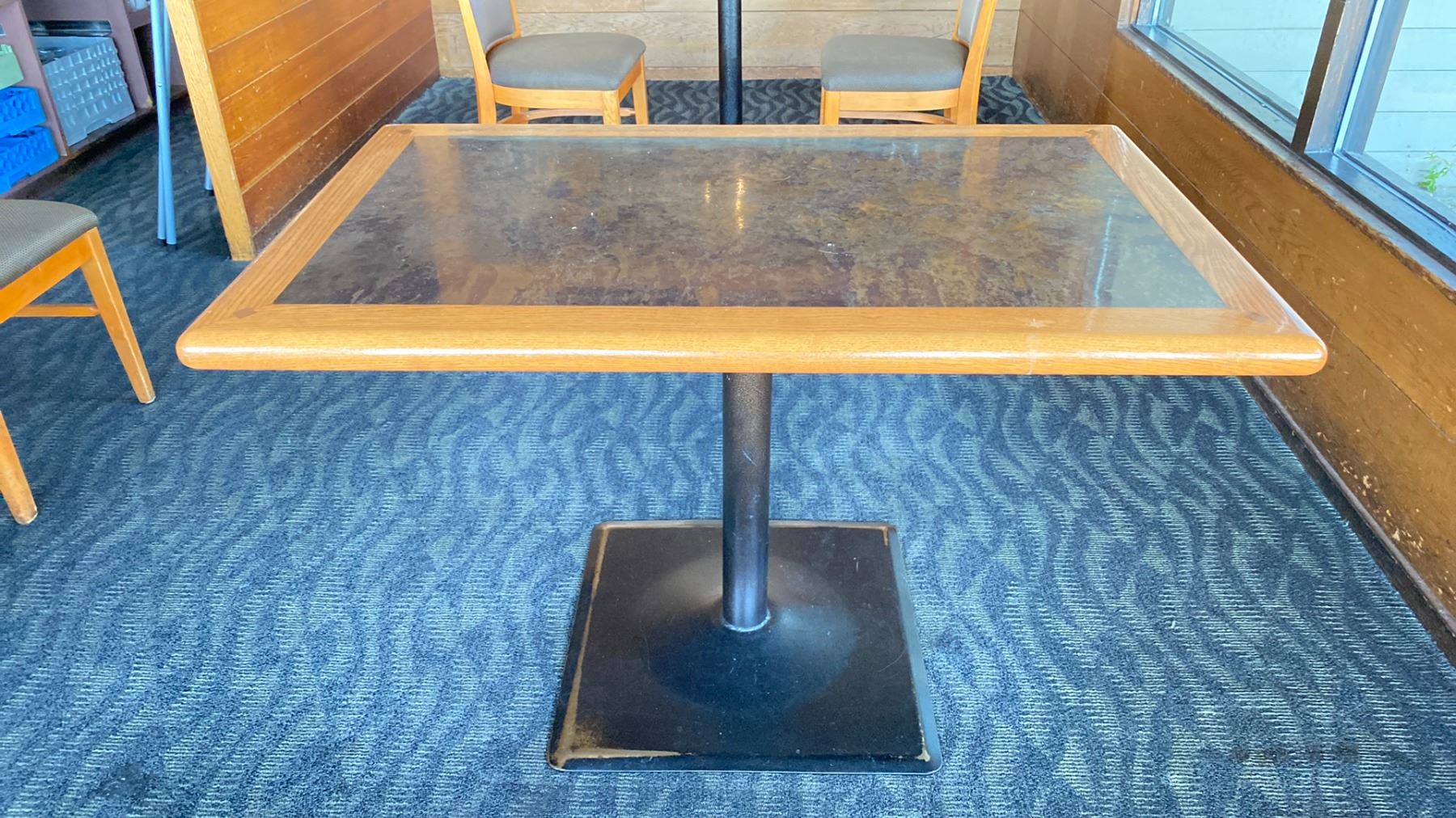 OAK TABLE WITH TWO TONE TOP BLACK METAL PEDESTAL APPROX 45" L X 28" W X 29"H