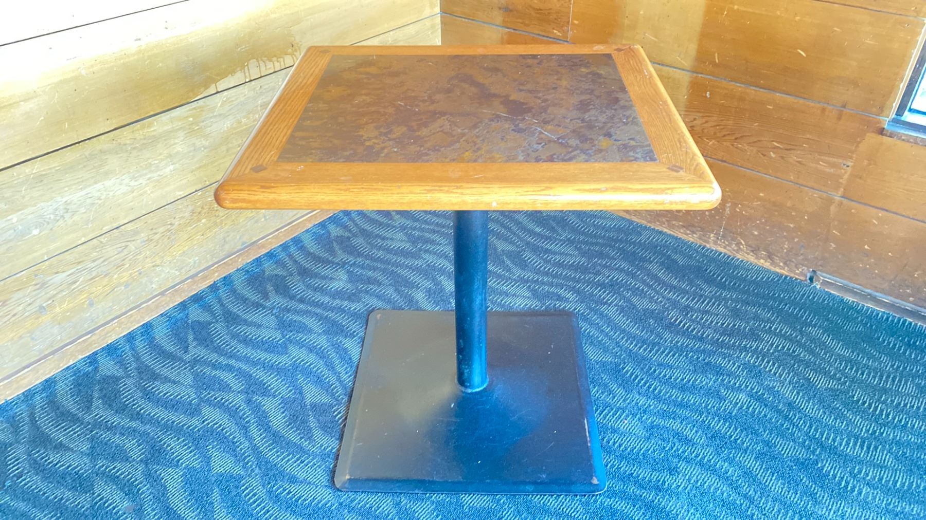 OAK TWO TONE TABLE WITH BLACK METAL PEDESTALS APPROX 28  L X 24  W X 29   H