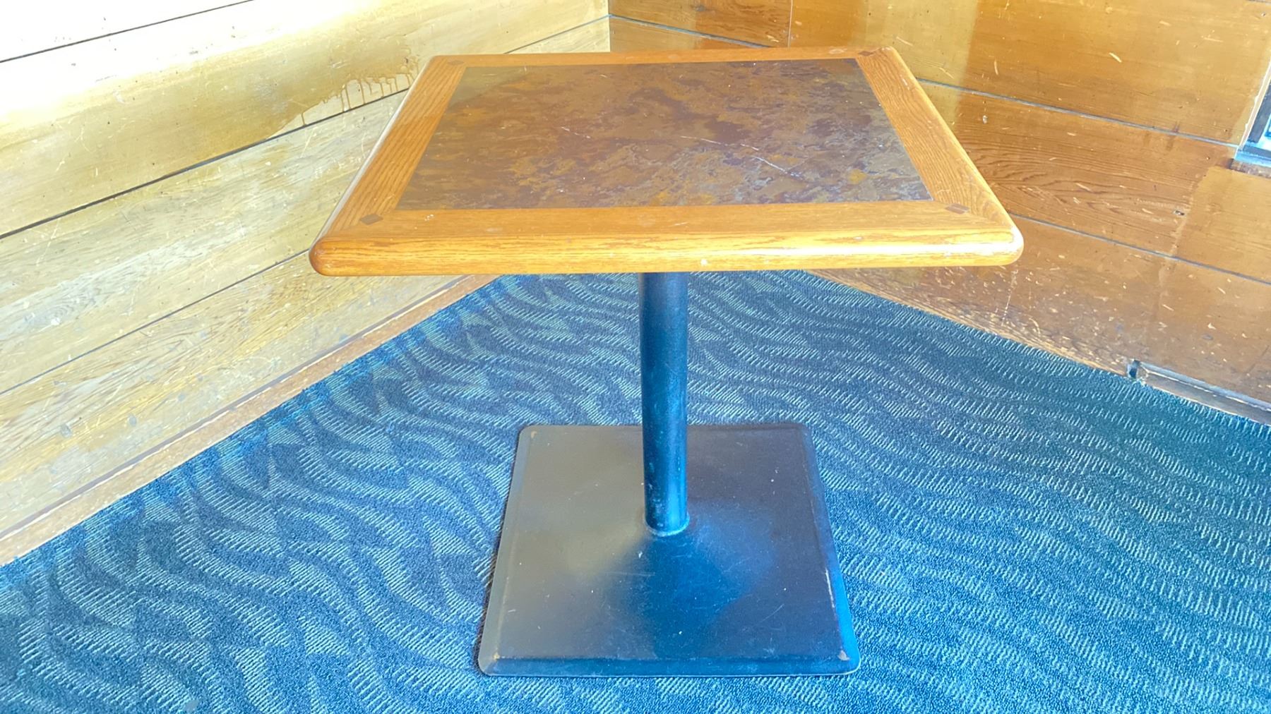 OAK TWO TONE TABLE WITH BLACK METAL PEDESTALS APPROX 28  L X 24  W X 29   H