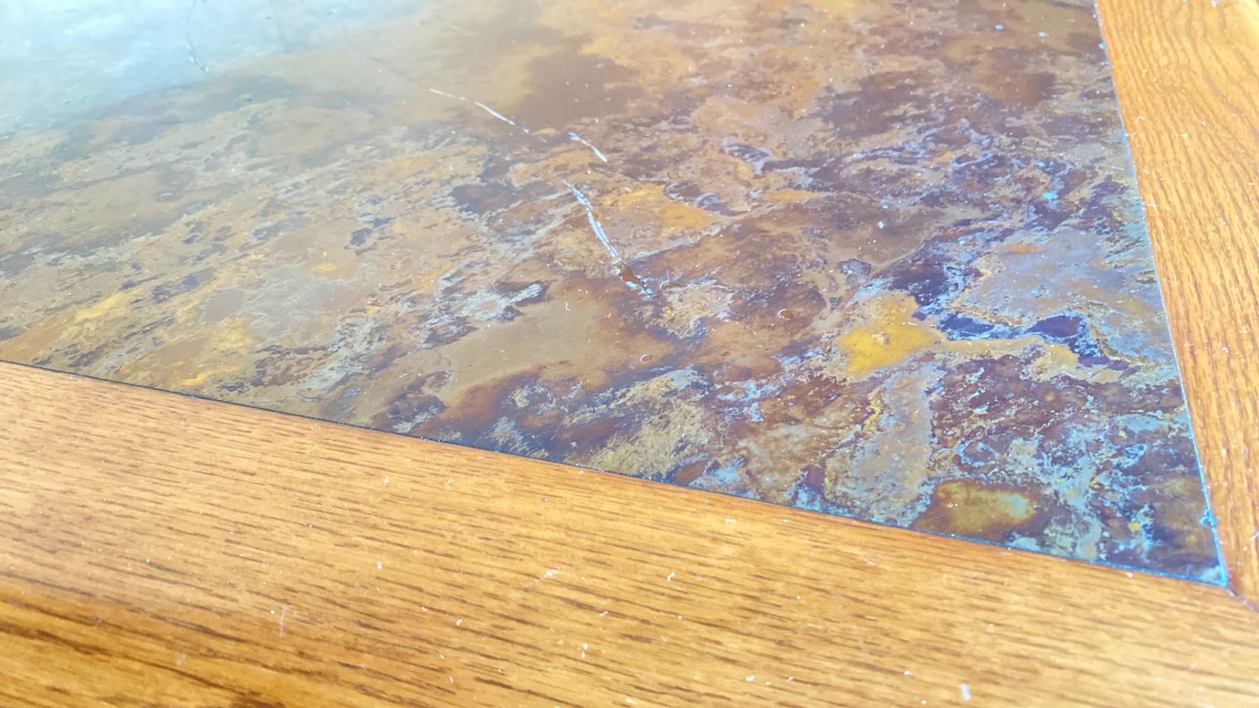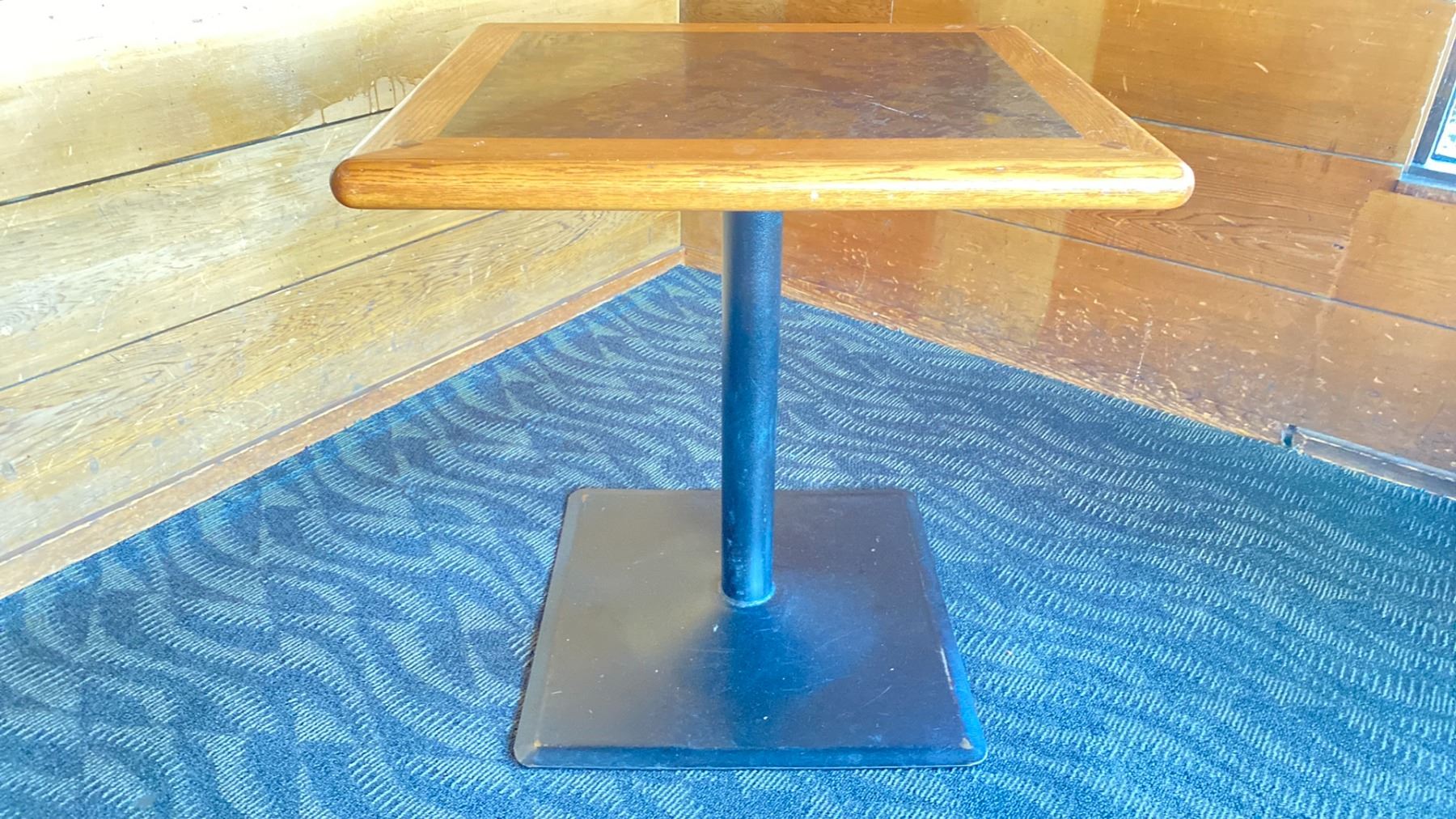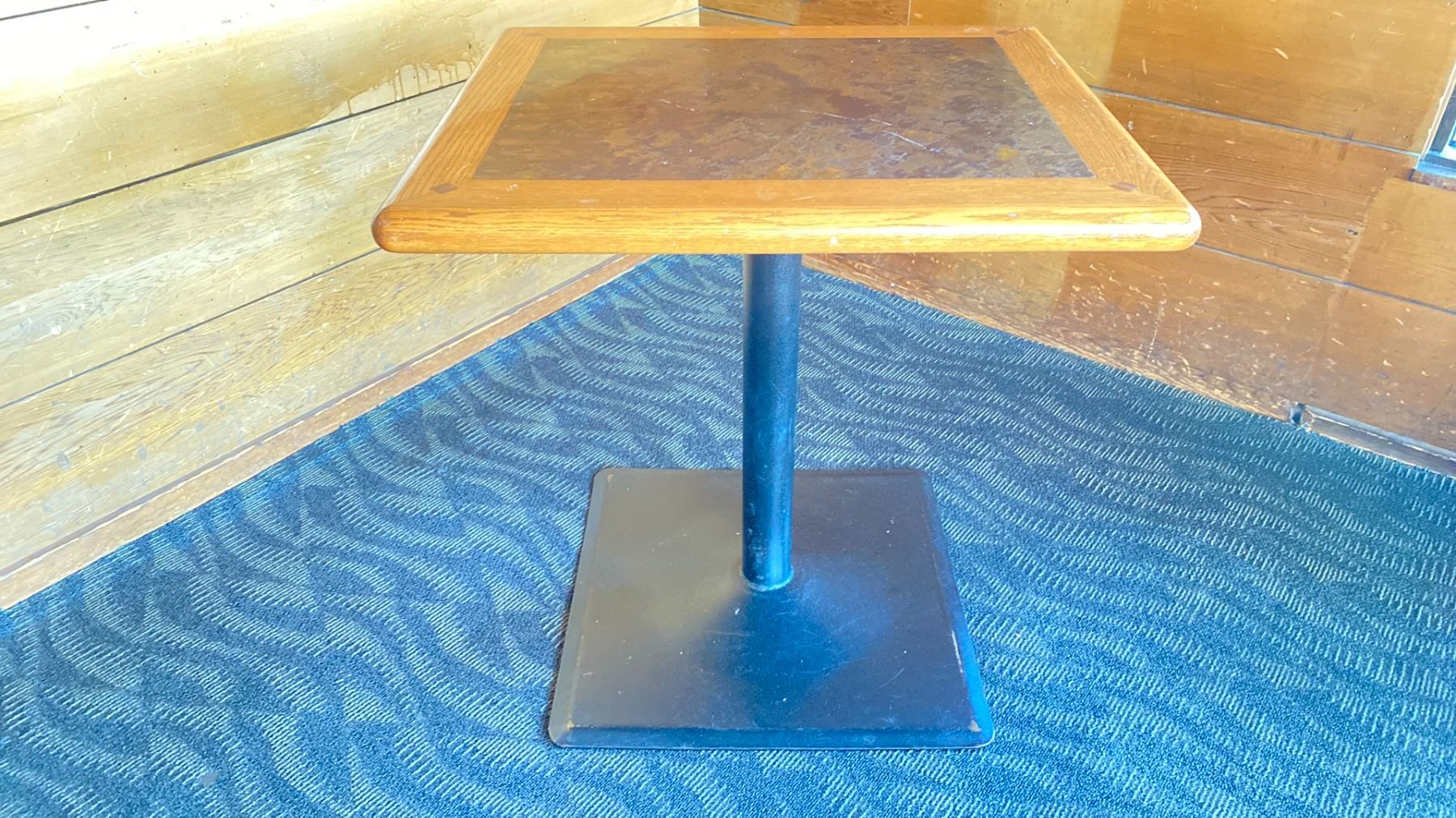 OAK TWO TONE TABLE WITH BLACK METAL PEDESTALS APPROX 28  L X 24  W X 29   H