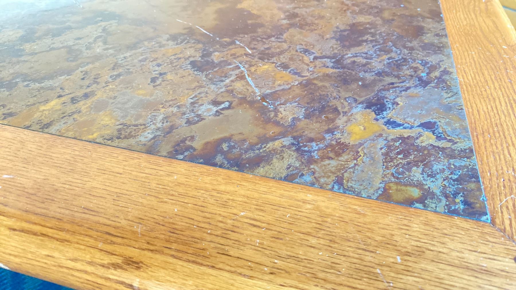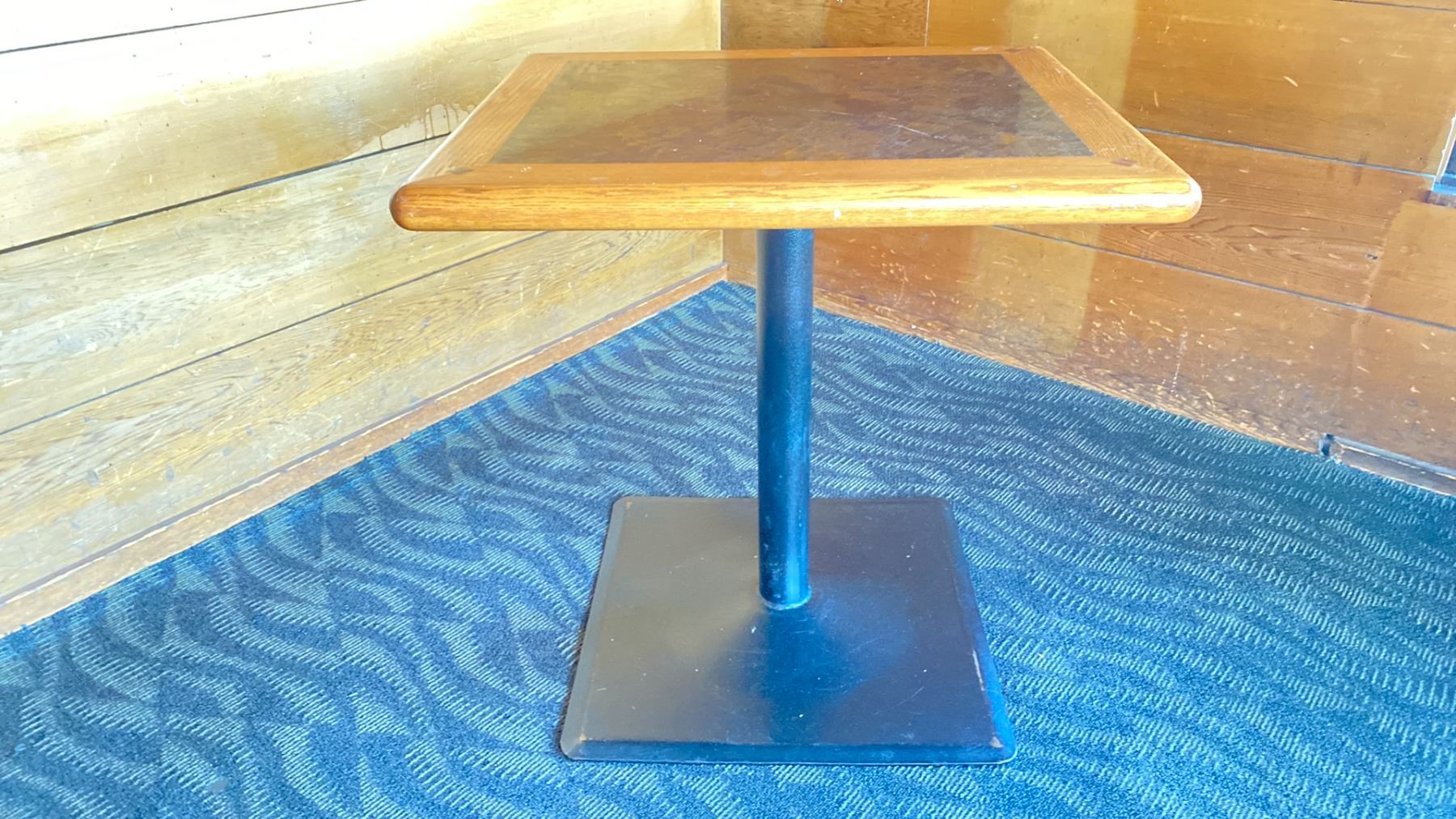 OAK TWO TONE TABLE WITH BLACK METAL PEDESTALS APPROX 28  L X 24  W X 29   H