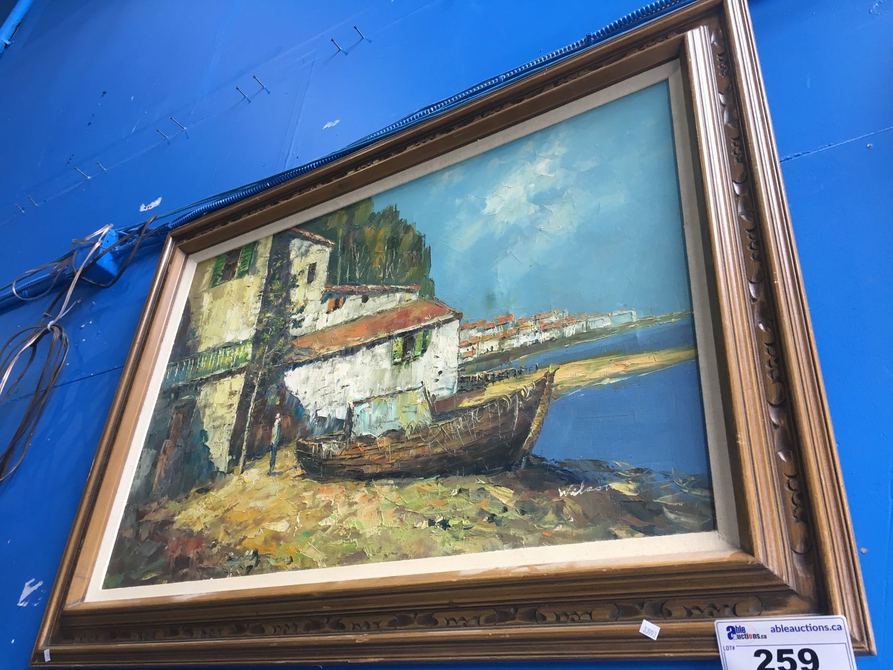 OCEAN SIDE TOWN FRAMED OIL ON CANVAS