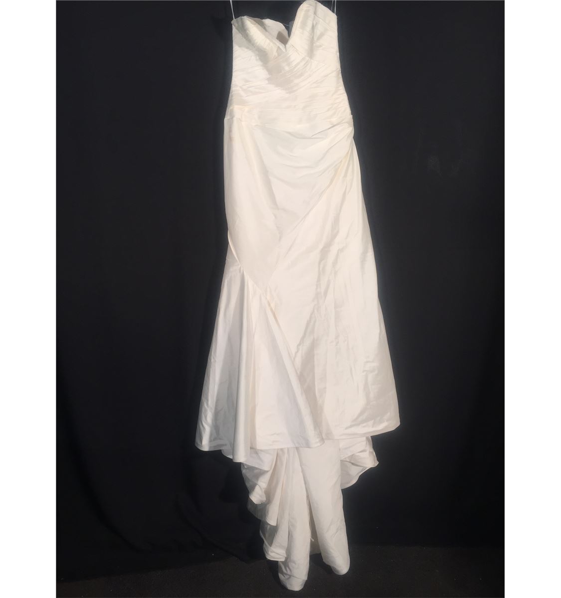 OFF WHITE SILK WEDDING DRESS W/ SWEETHEART NECKLINE, ROUCHED BODICE AND TRAIN, SIZE 12 *NEEDS REPAIRS*