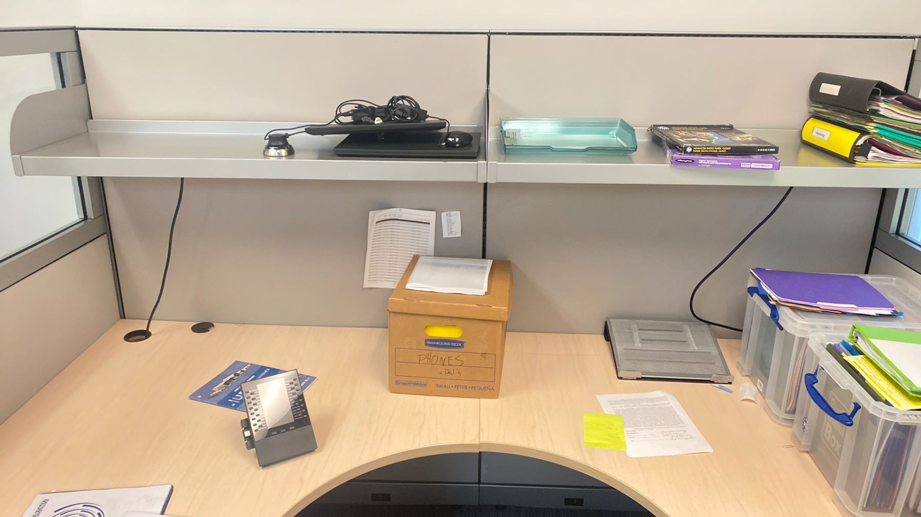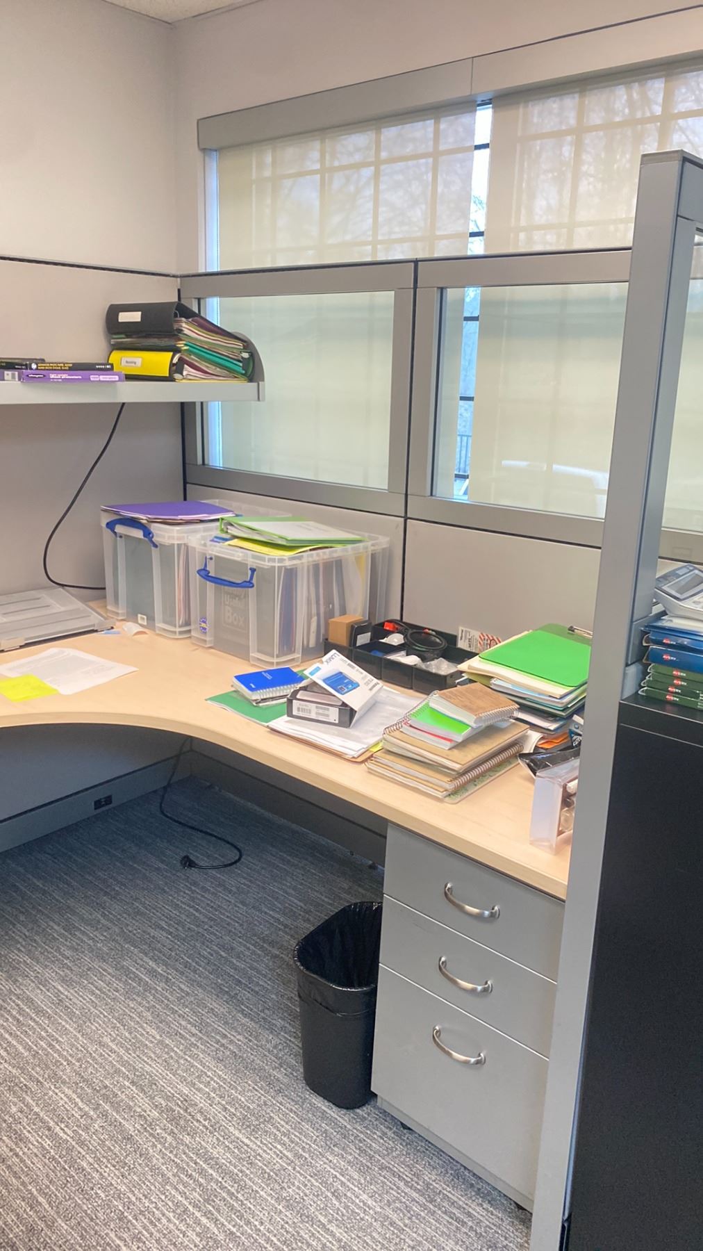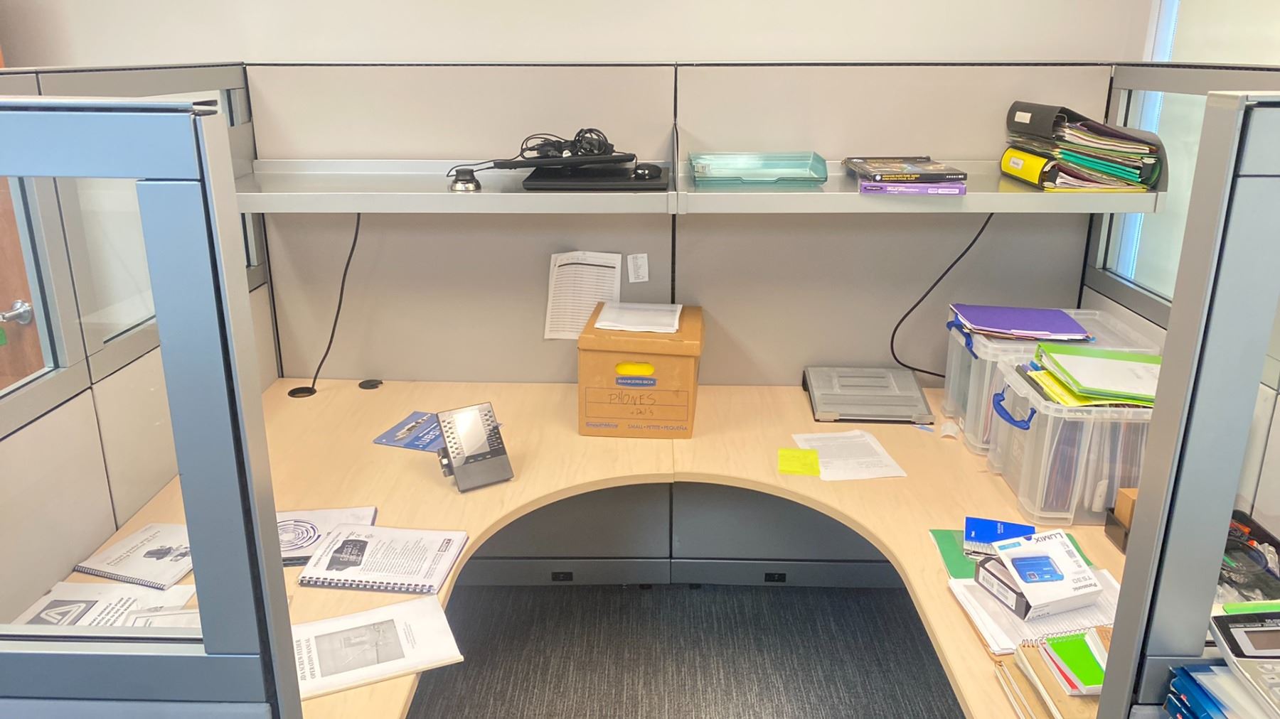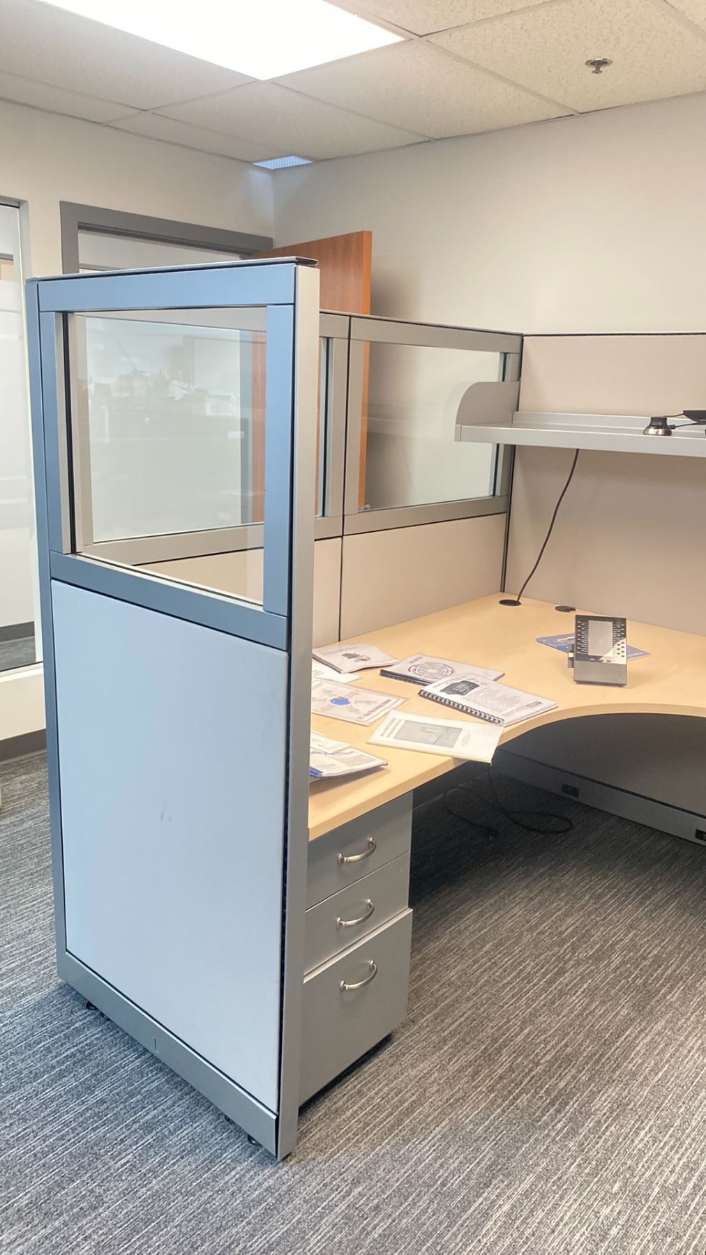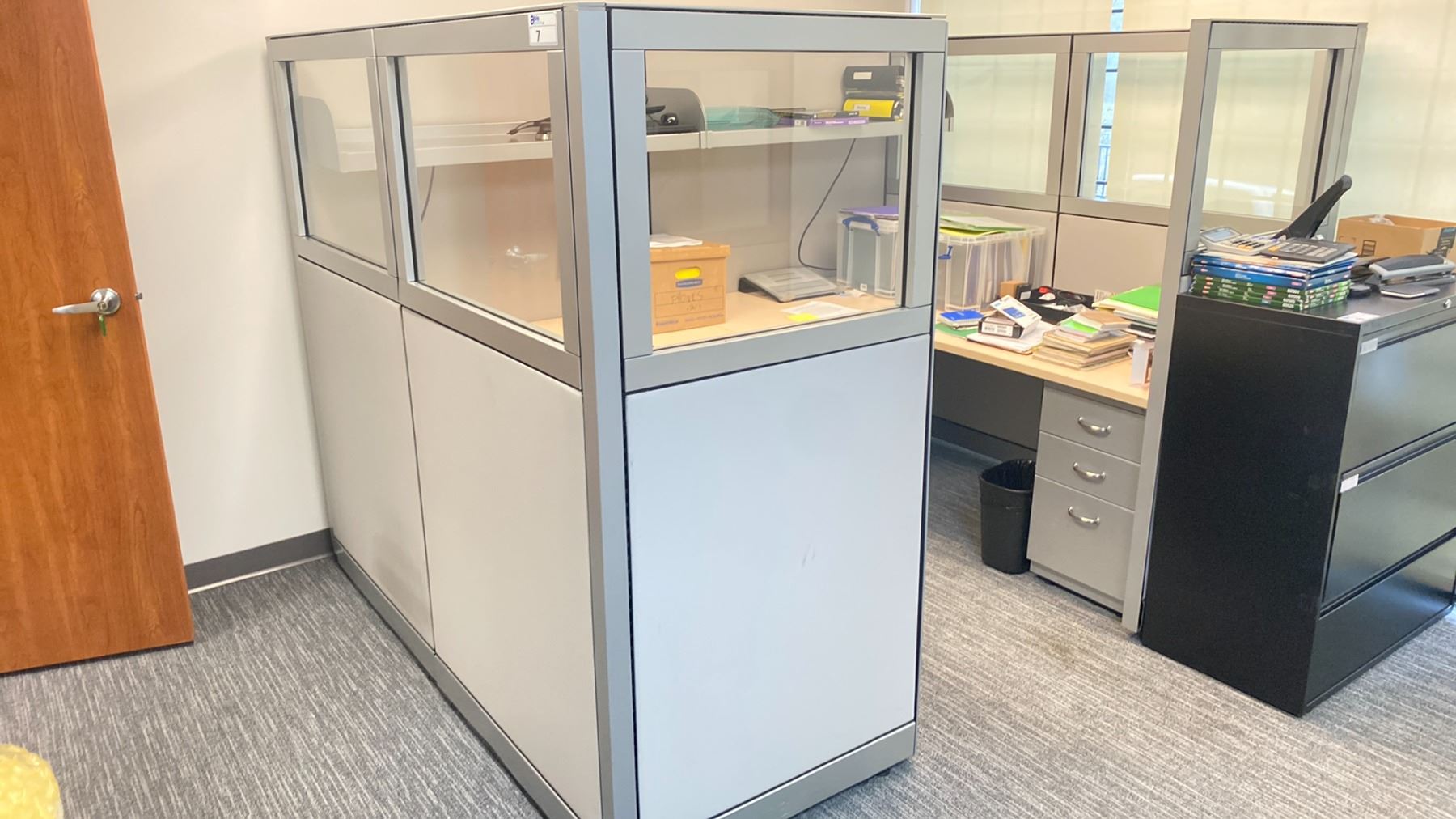 OFFICE CUBICLE WITH 8 SECTION PARTITION- 101"W X 76"D X 67"H, A LIGHT WOODEN 96"W X 72"L X 29"H U SHAPED DESK & 2 GREY 3 DRAWER PEDESTALS *CONTENTS NOT INCLUDED*