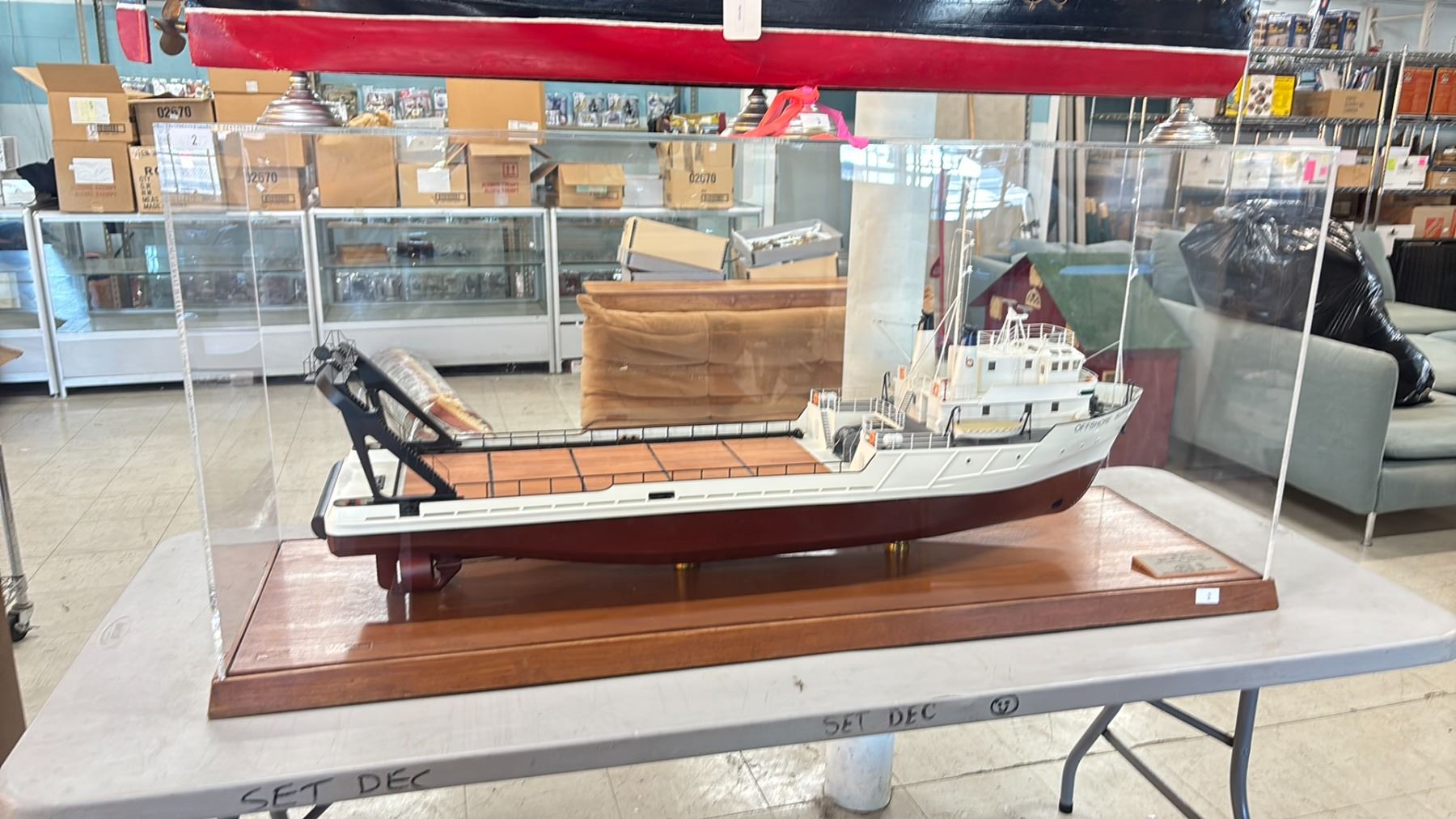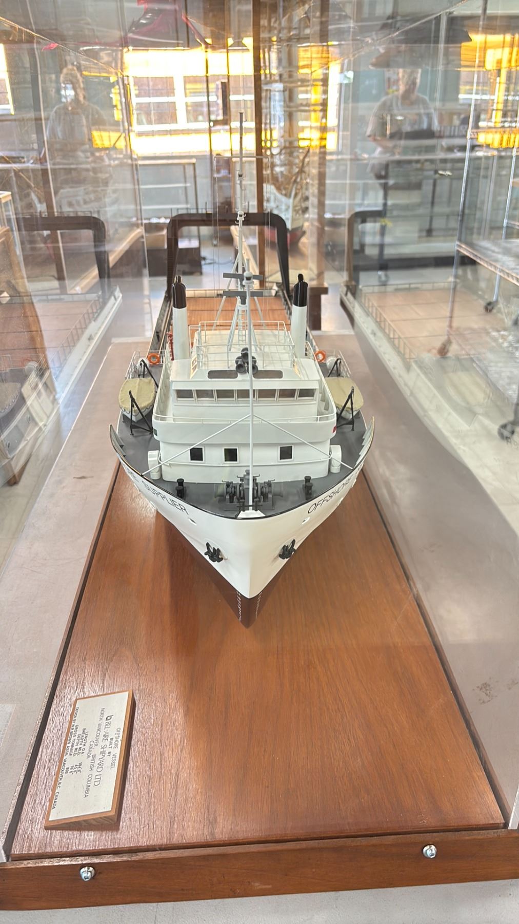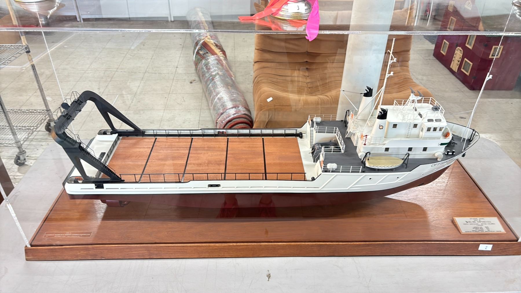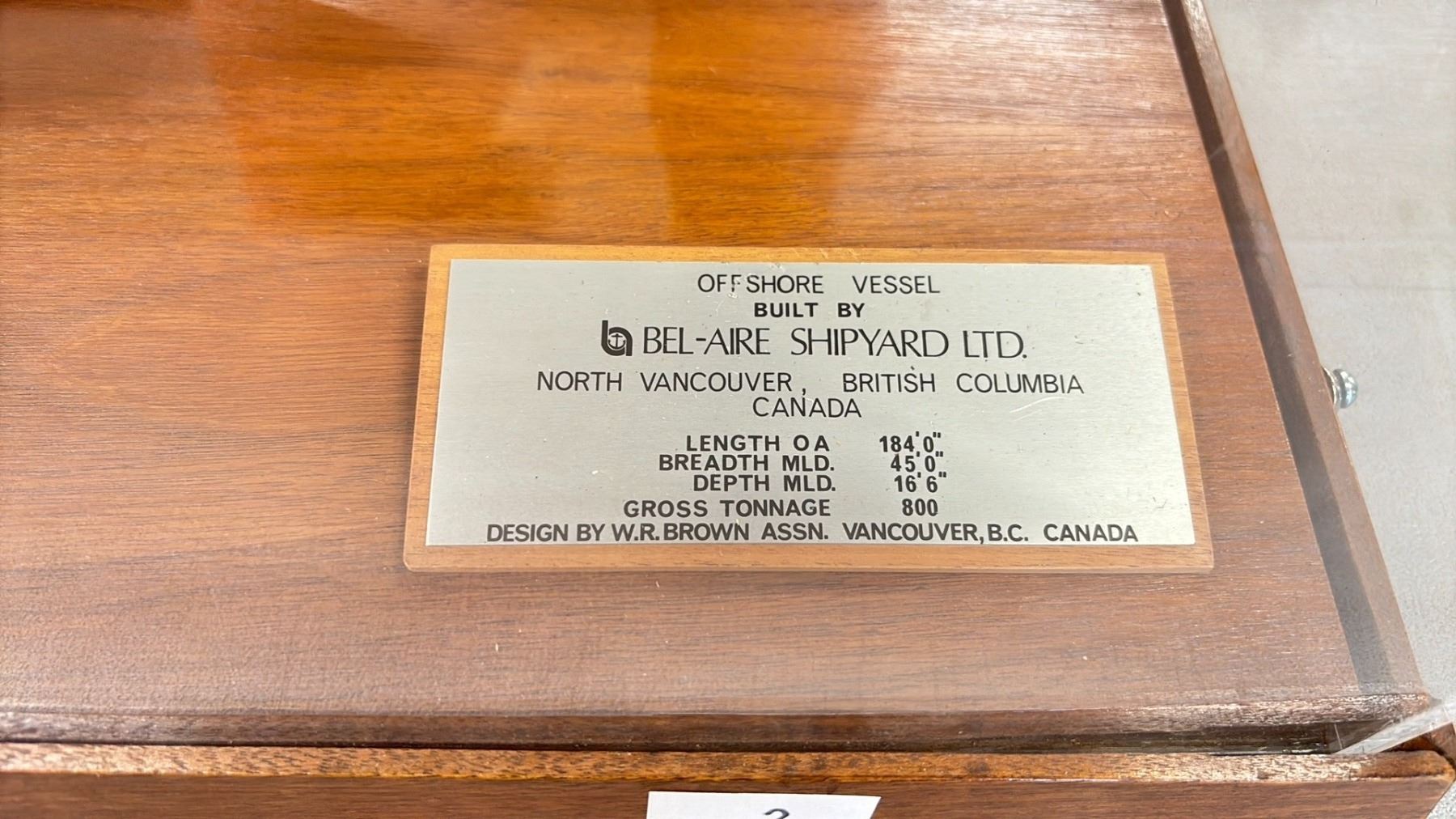 OFFSHORE SUPPLIER VESSEL MODEL SHIP IN DISPLAY CASE WITH INFO PLAQUE APPROXIMATE SHIP MEASUREMENTS: 45" X 11" X 17"H APPROXIMATE CASE MEASUREMENTS: 54" X 16" X 25"H
