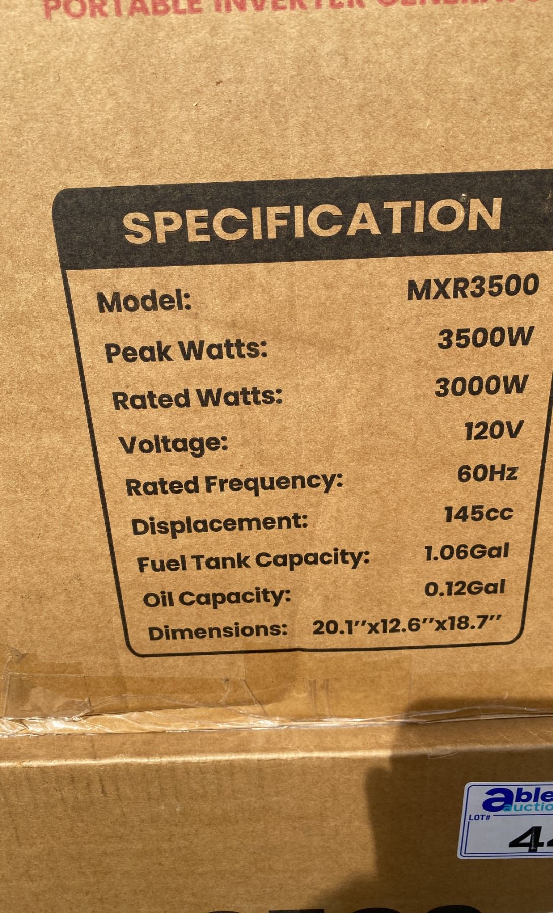 OHV ENGINE ( MXR3500 ) PORTABLE INVERTER GAS POWERED GENERATOR WITH A 1.06 GALLON FUEL CAPACITY *IN BOX*