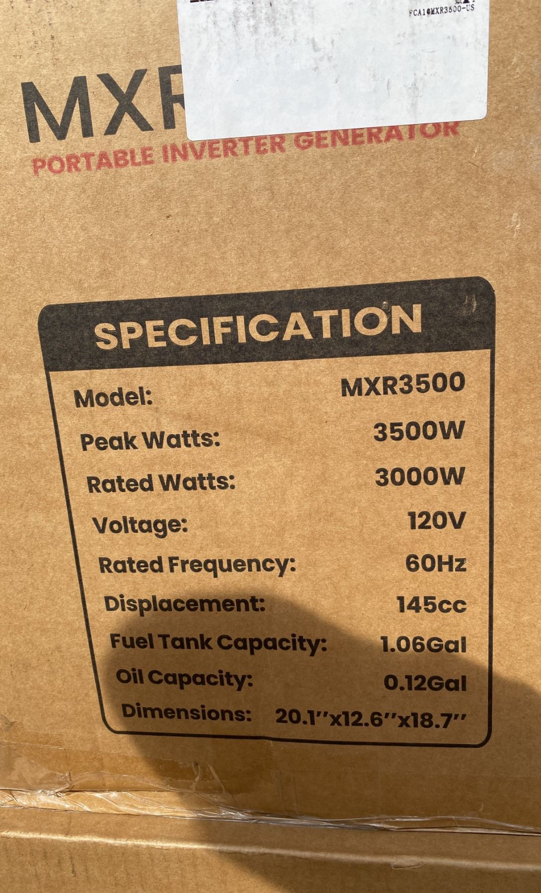 OHV ENGINE ( MXR3500 ) PORTABLE INVERTER GAS POWERED GENERATOR WITH A 1.06 GALLON FUEL CAPACITY *IN BOX*