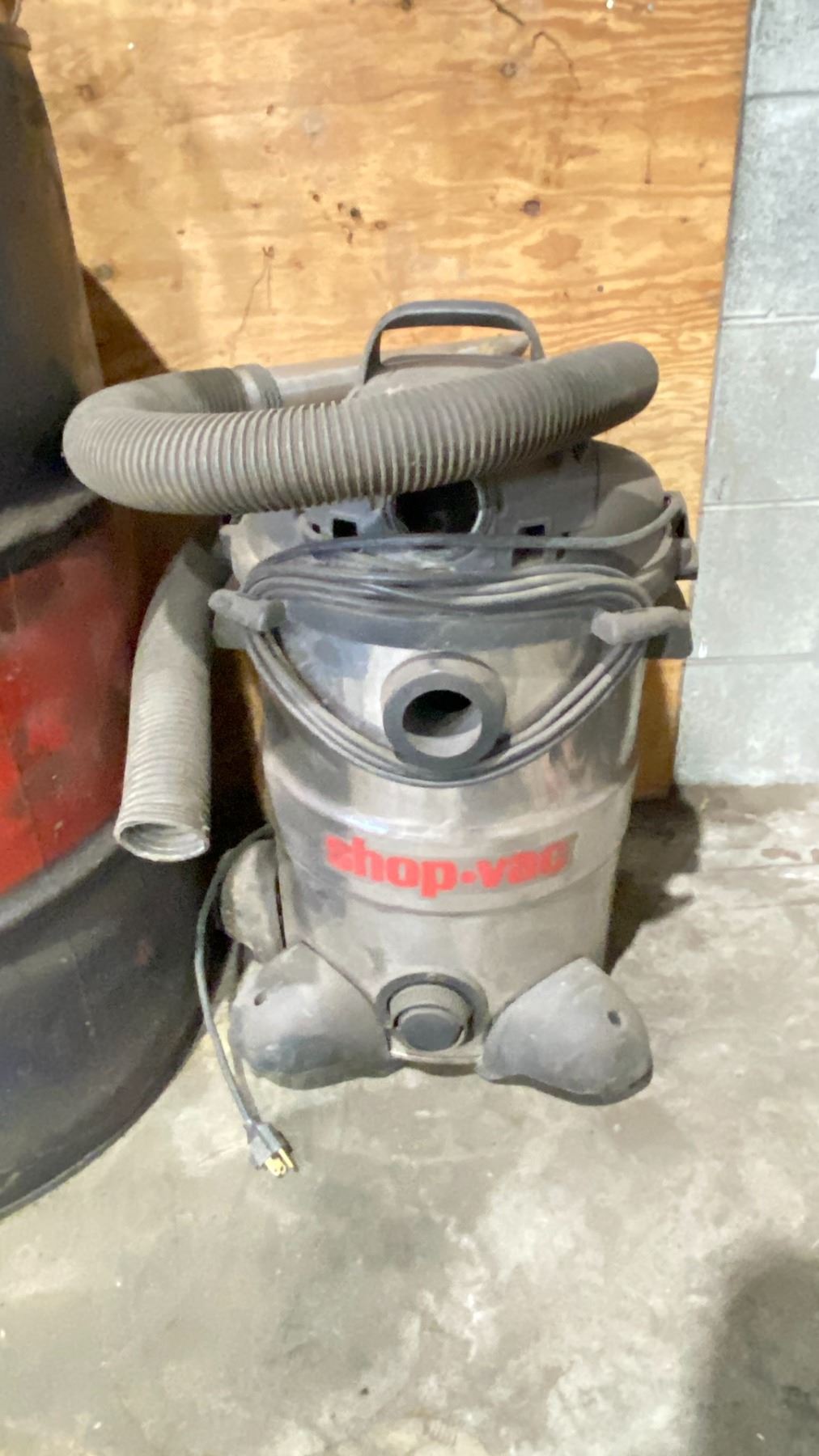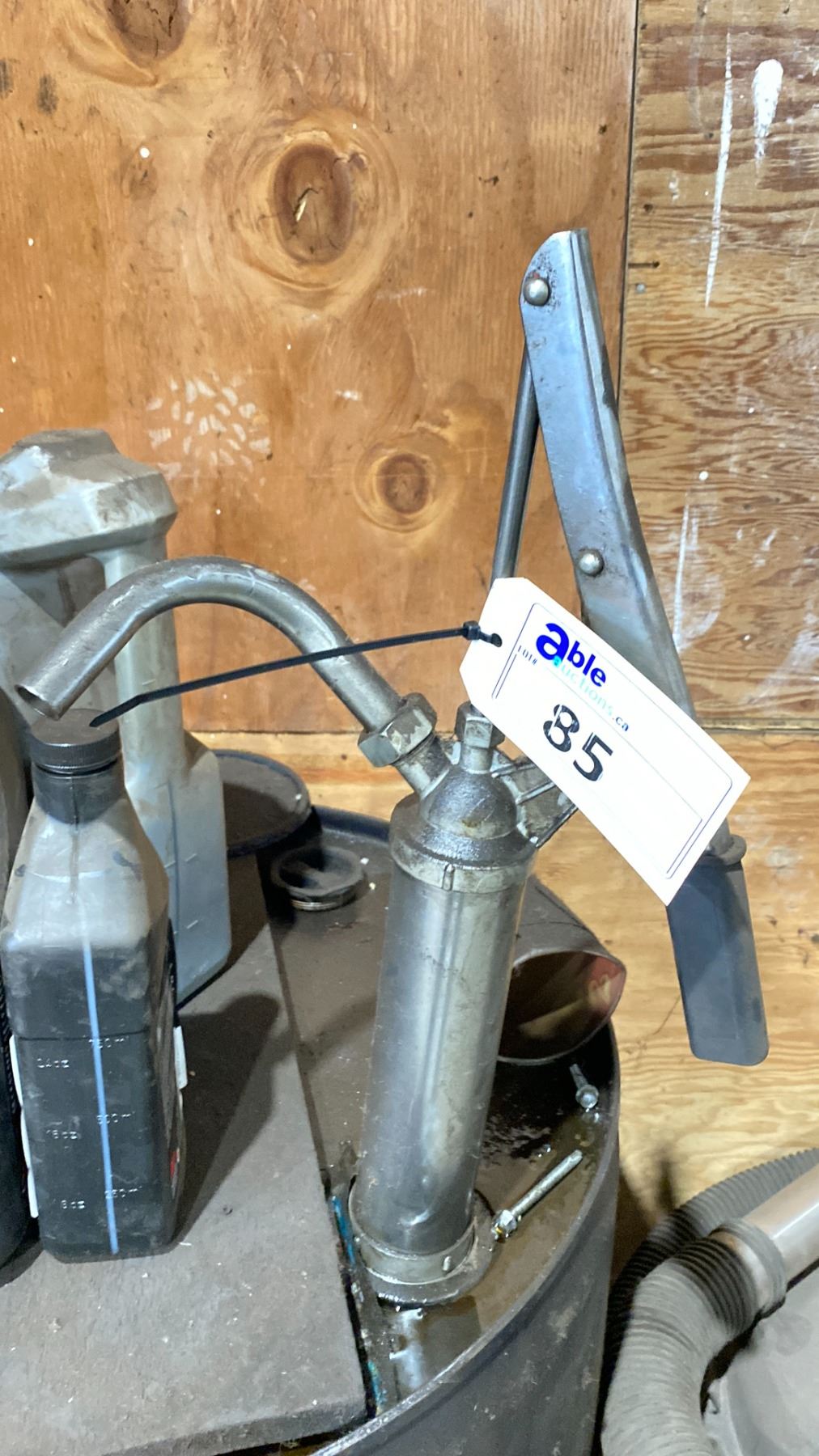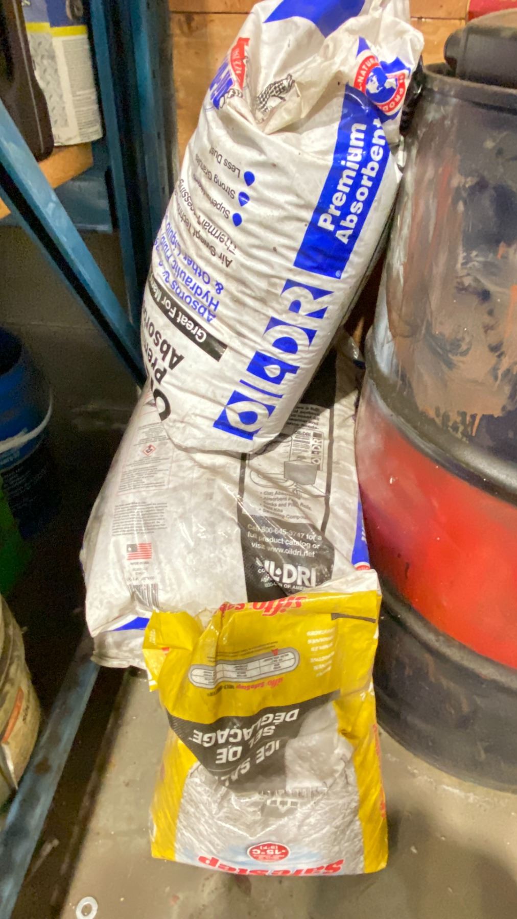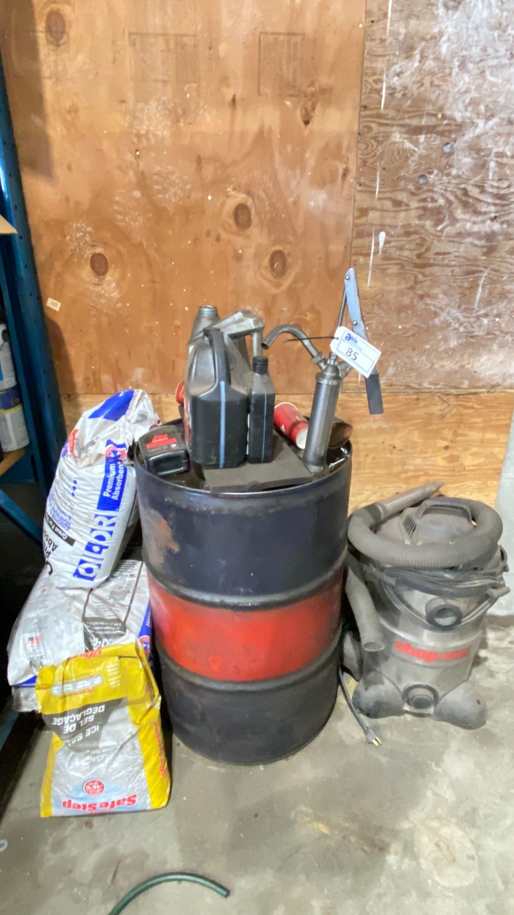 OIL DRUM (PARTIALLY FULL) WITH PUMP, SHOP VAC, OIL ABSORBENT & ROAD SALT