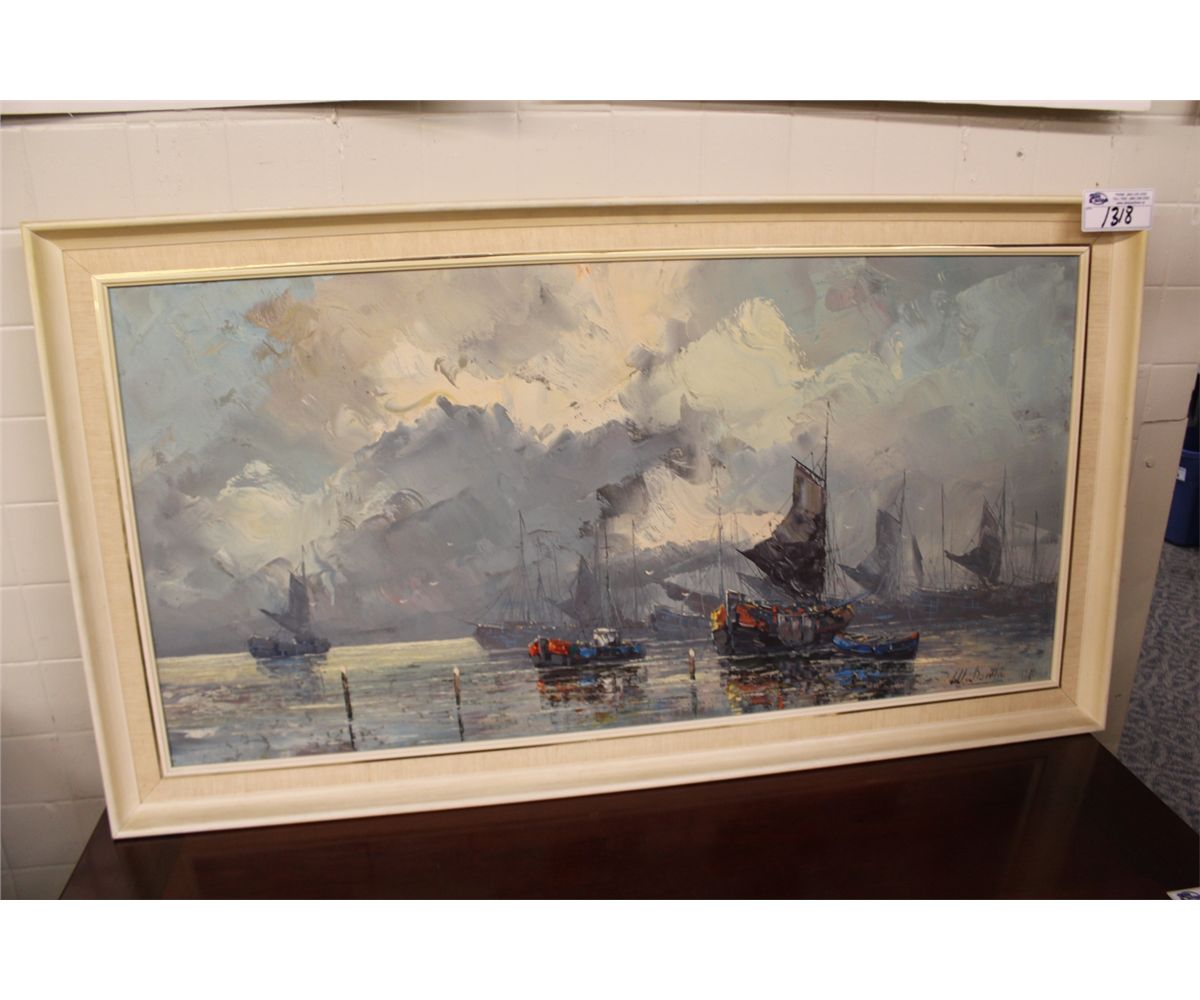 OIL ON CANVAS DEPICTING BOATS AT SEA 48" X 24" SIGNED LOWER RIGHT "WILL NORDEN"