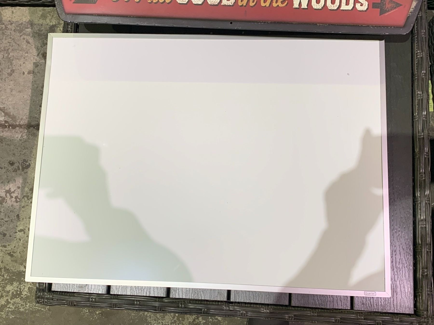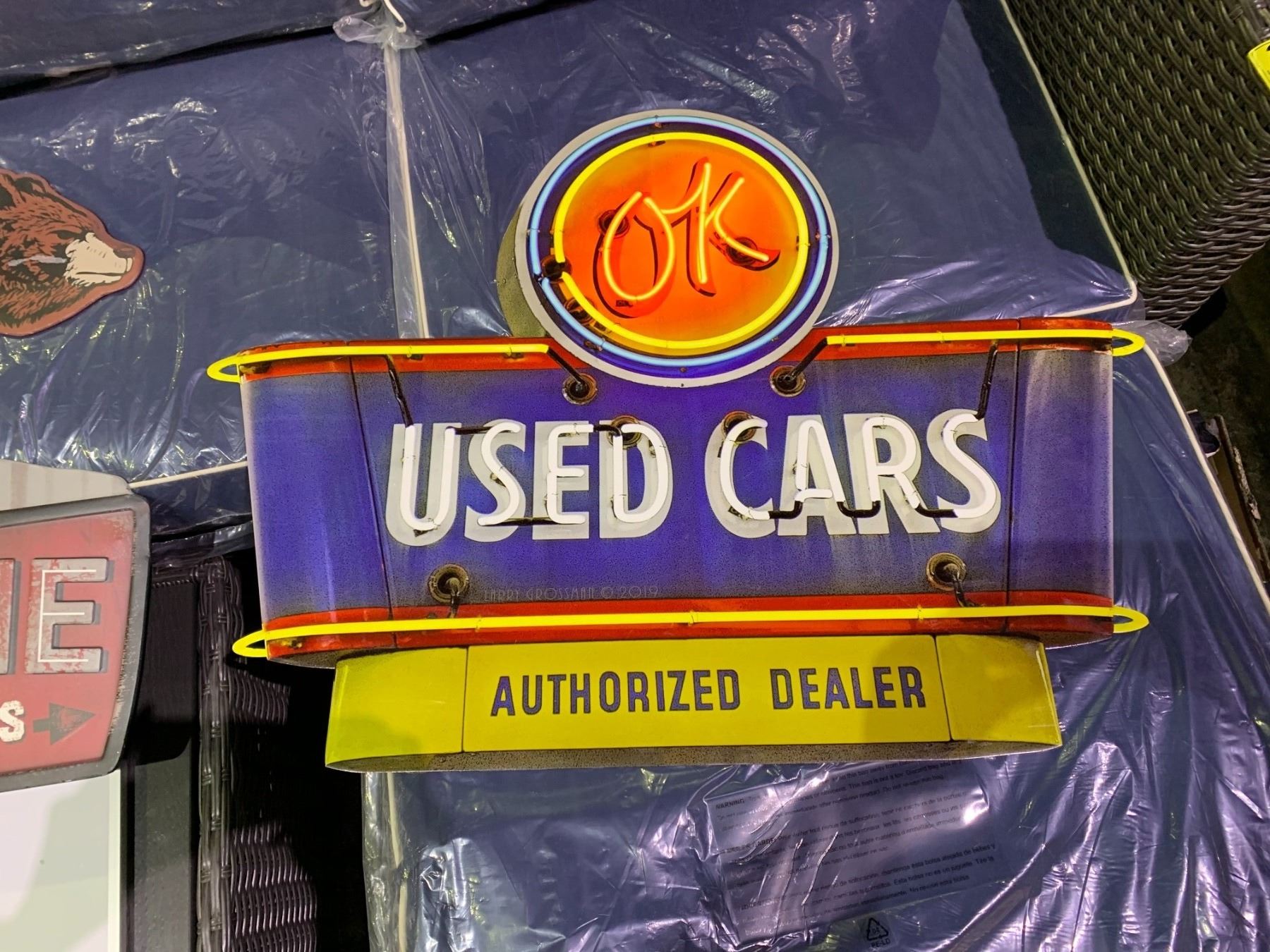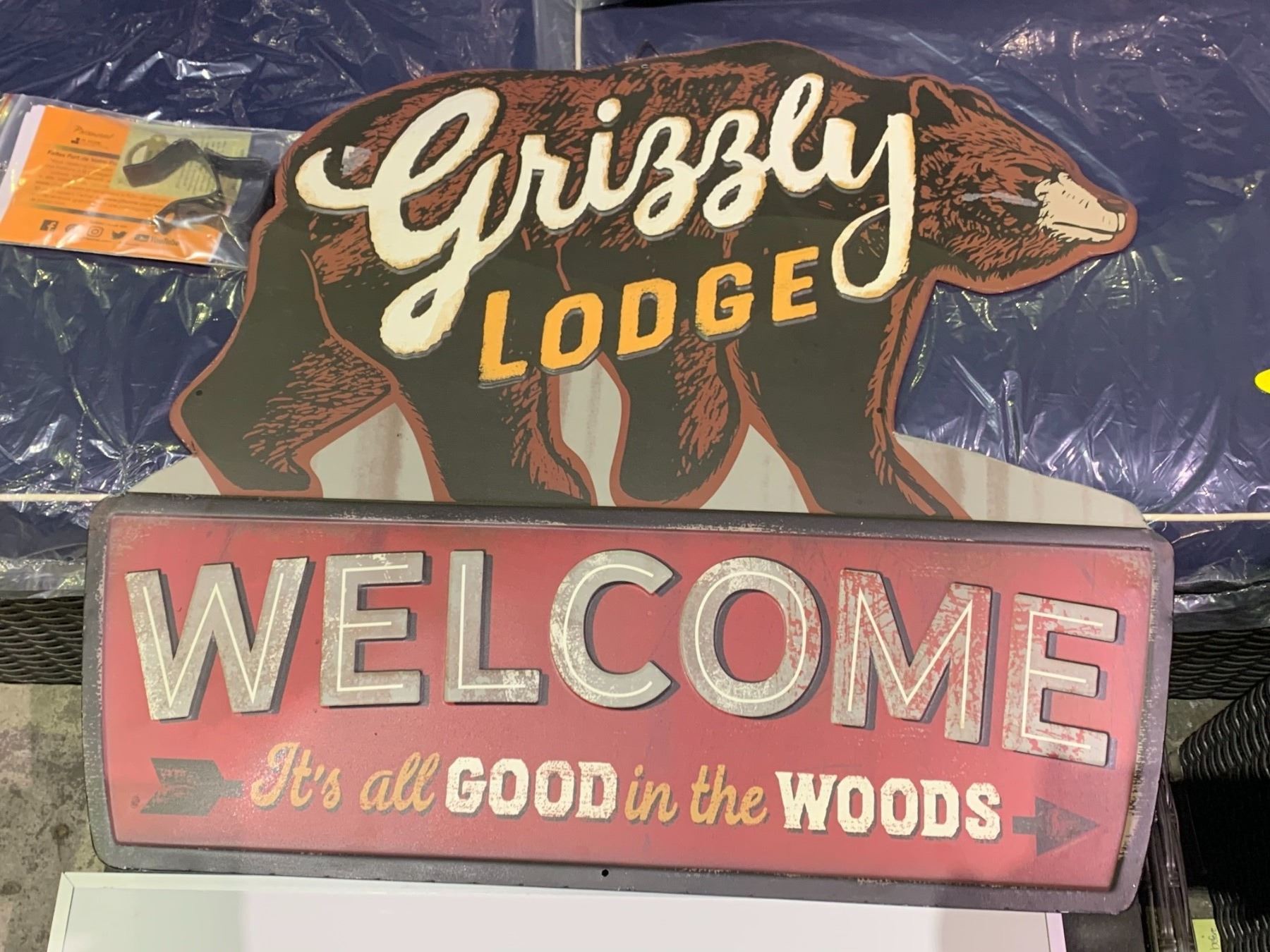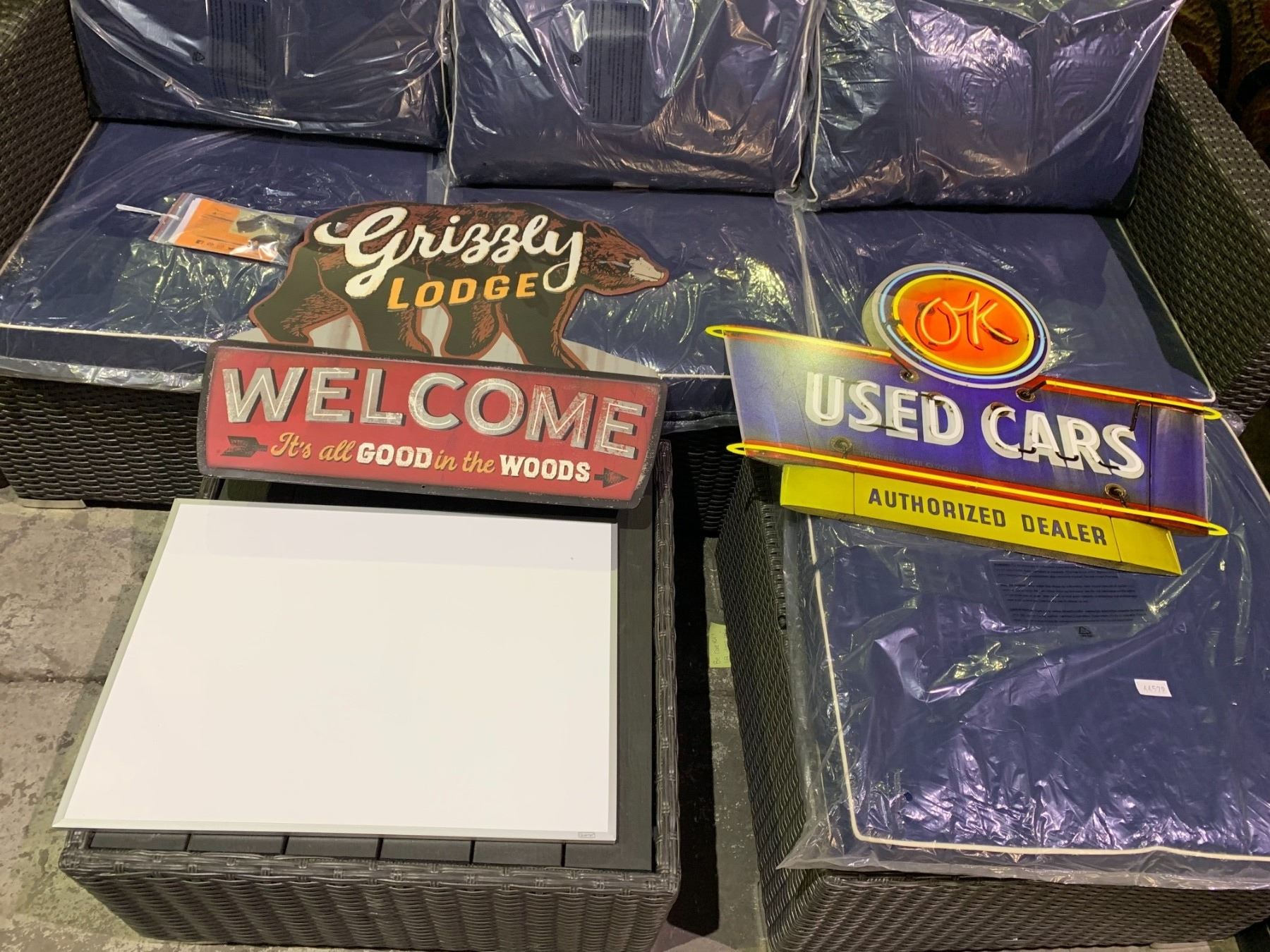 OK USED CARS DEALER TIN SIGN, GRIZZLY LODGE WELCOME TIN SIGN AND WHITEBOARD