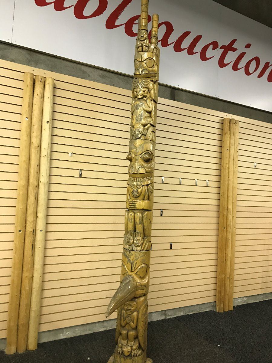 OLDER HAIDA 10' TALL 6 FIGURE TOTEM POLE FEATURING: RAVEN, BEAR AND FROG WITH THREE WATCHMEN ON TOP. POLE HAS MANY FIGURES CARVED WITHIN THE MAIN FIGURES. POLE IS A REPLICA OF AN 1889 CARVED POLE IN MASSETT