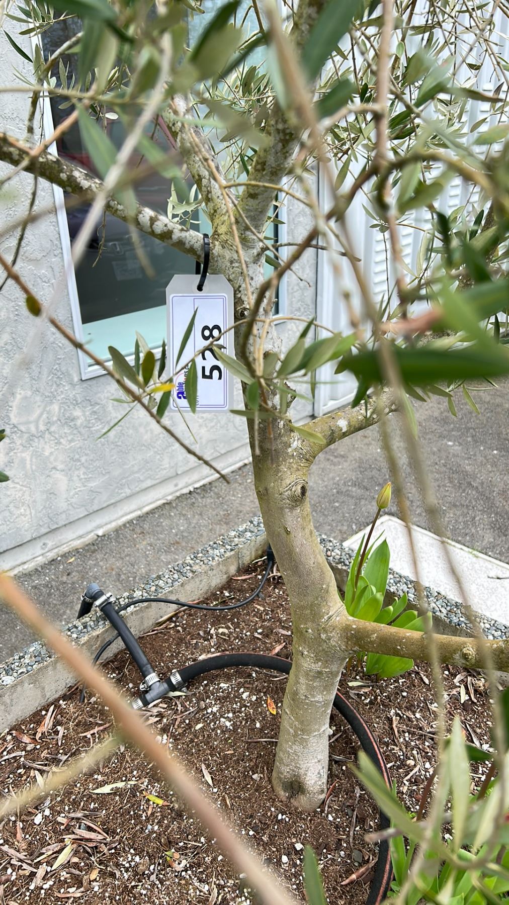OLIVE TREE PLUS SPRING PLANTS. OVERALL HEIGHT APPROX 7' IN 3'X3' CONCRETE POT APPROX 24  H