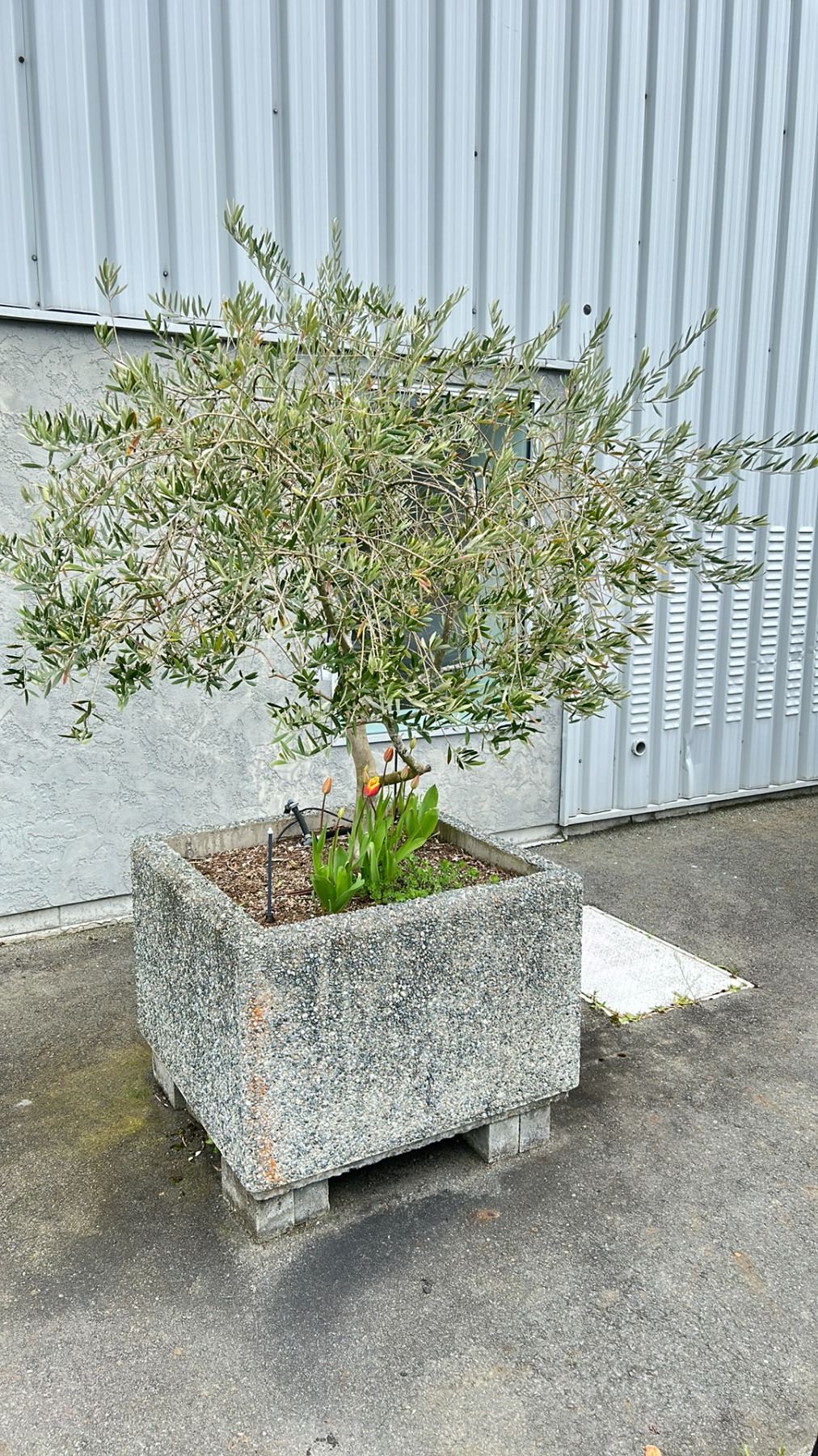 OLIVE TREE PLUS SPRING PLANTS. OVERALL HEIGHT APPROX 7' IN 3'X3' CONCRETE POT APPROX 24" H