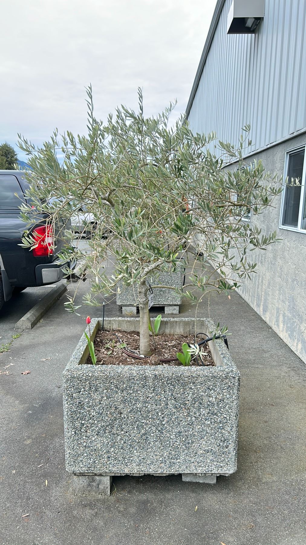 OLIVE TREE PLUS SPRING PLANTS. OVERALL HEIGHT APPROX 7' IN 3'X3' CONCRETE POT APPROX 24" H