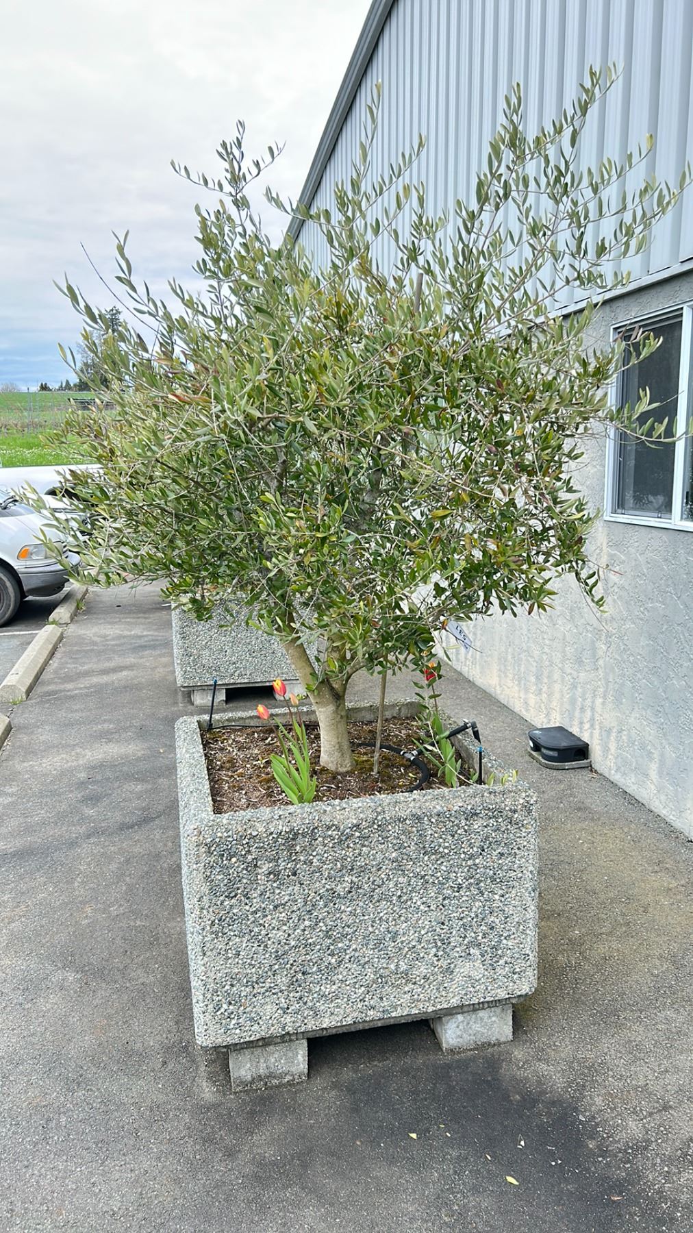 OLIVE TREE PLUS SPRING PLANTS. OVERALL HEIGHT APPROX 7' IN 3'X3' CONCRETE POT APPROX 24" H