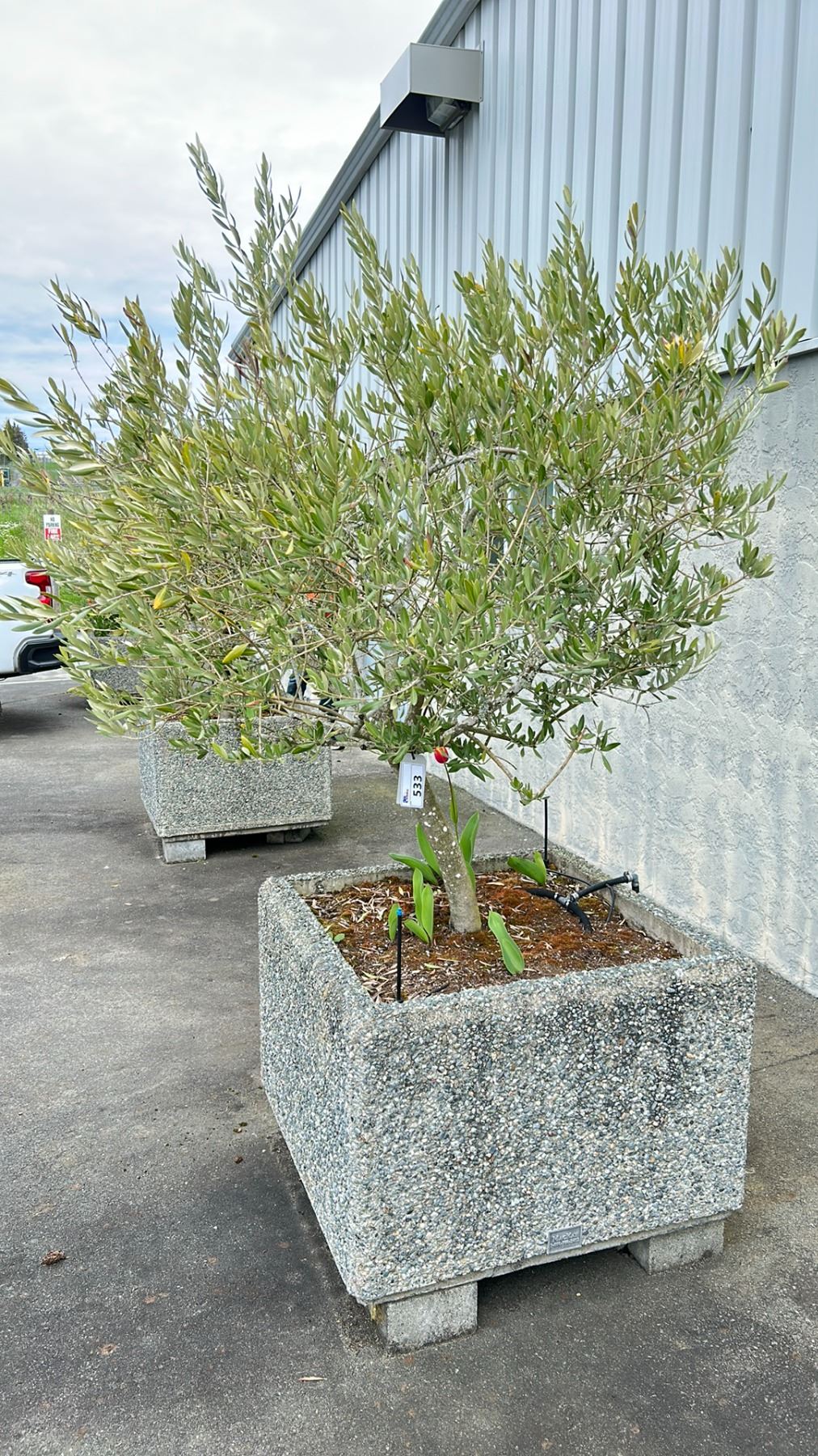 OLIVE TREE PLUS SPRING PLANTS. OVERALL HEIGHT APPROX 7' IN 3'X3' CONCRETE POT APPROX 24  H