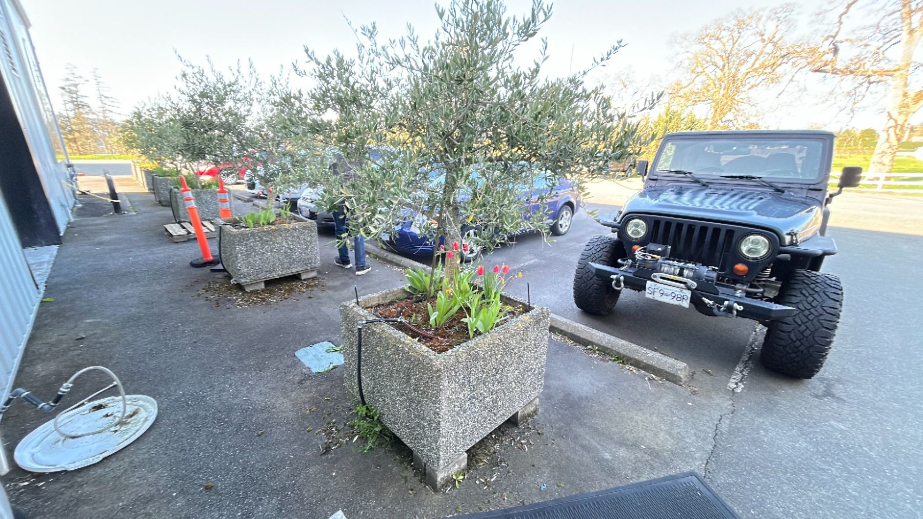 OLIVE TREE PLUS SPRING PLANTS. OVERALL HEIGHT APPROX 7' IN 3'X3' CONCRETE POT APPROX 24" H