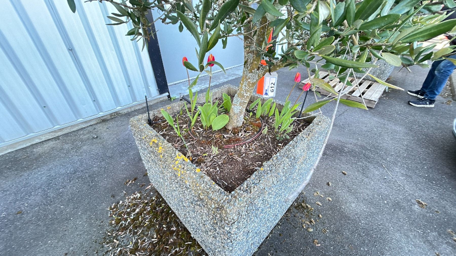 OLIVE TREE PLUS SPRING PLANTS. OVERALL HEIGHT APPROX 7' IN 3'X3' CONCRETE POT APPROX 24" H