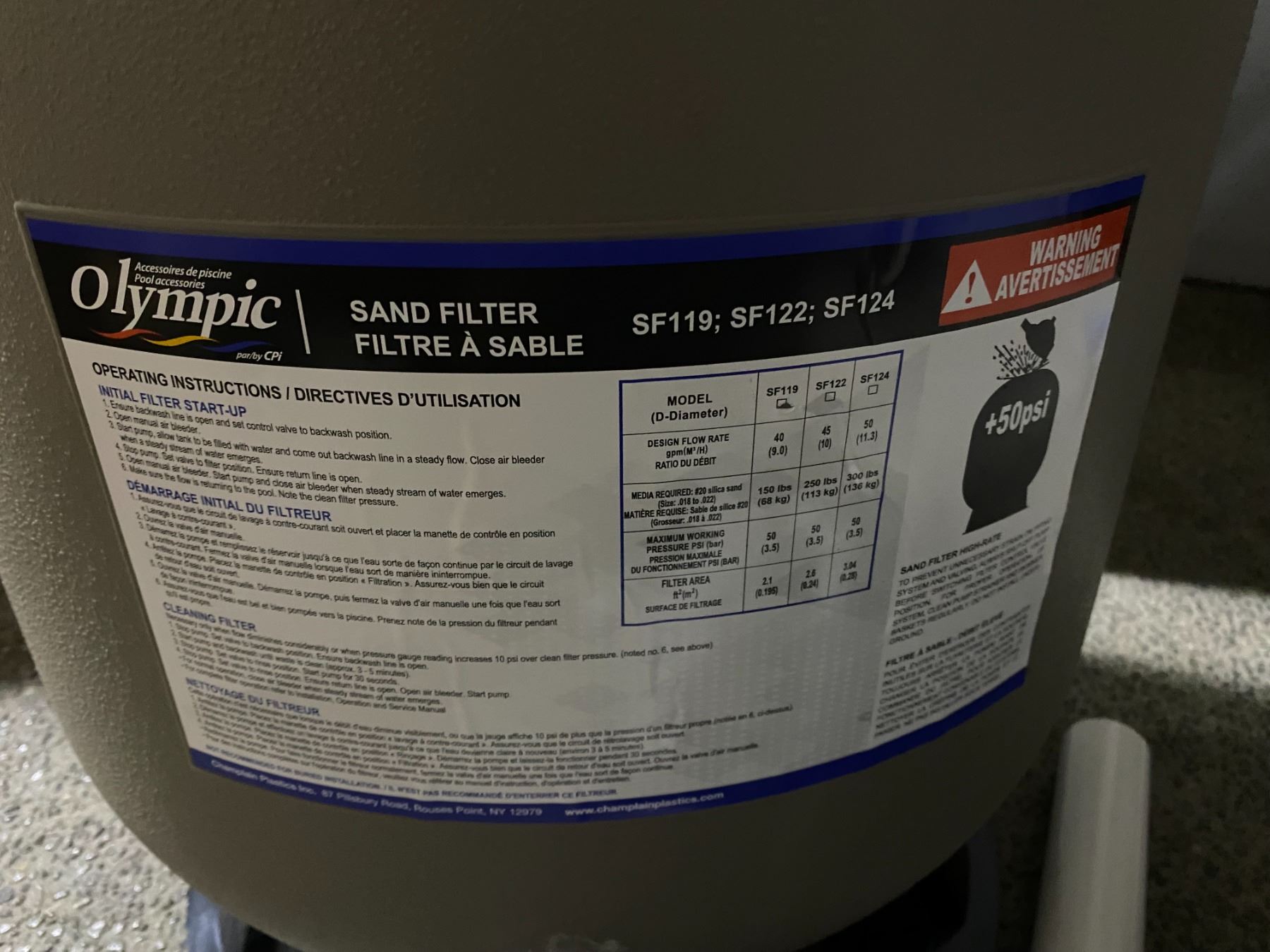 OLYMPIC SAND FILTER SYSTEM. MODEL SF119. HOLDS 150 LBS SAND.