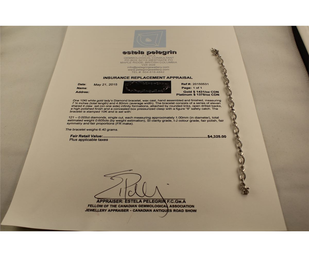 ONE 10KT WHITE GOLD LADIES DIAMOND BRACELET MEASURING 7.5 INCHES, 4 CLAW SET WITH 121- 0.0005CT SINGLE CUT DIAMONDS. APPROX. 0.60CT WEIGHS 6.4 GRAMS. REPLACEMENT VALUE $4325