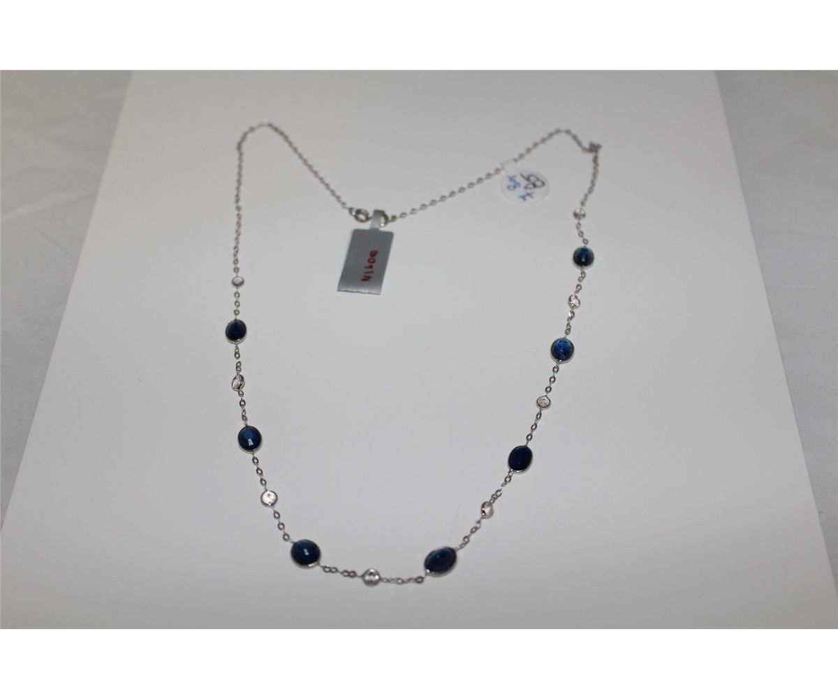 ONE 10KT WHITE GOLD NATURAL BLUE AND WHITE SAPPHIRE STATION STYLE NECKLACE. 46CM LONG CHAIN, 7 OVAL MIXED CUT NATURAL BLUE SAPPHIRES APPROX 6.80CARAT. 8 ROUND WHITE SAPPHIRES APPROX WEIGHT 1.00CARAT. NECKLACE WEIGHT 3.20 GRAMS. REPLACEMENT VALUE $1,200.00