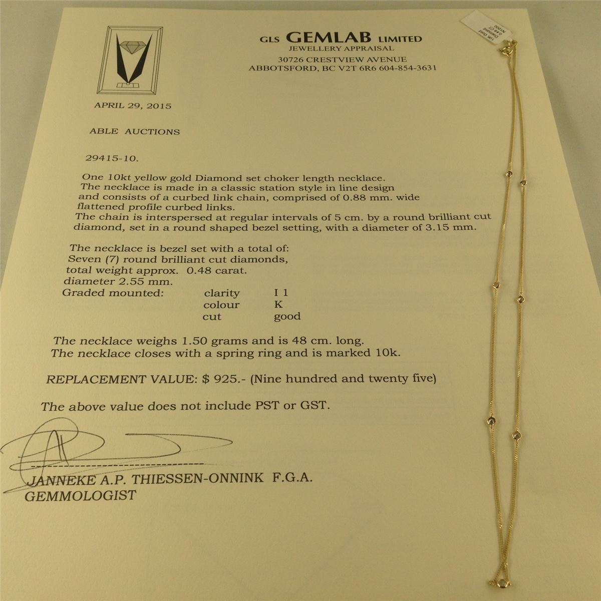ONE 10KT YELLOW GOLD DIAMOND SET CHOKER LENGTH NECKLACE, SET WITH SEVEN ROUND BRILLIANT CUT DIAMONDS 0.48CT, I1, K COLOUR REPLACEMENT VALUE $925