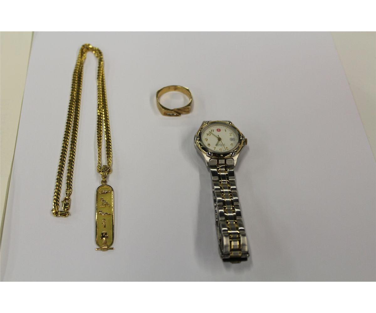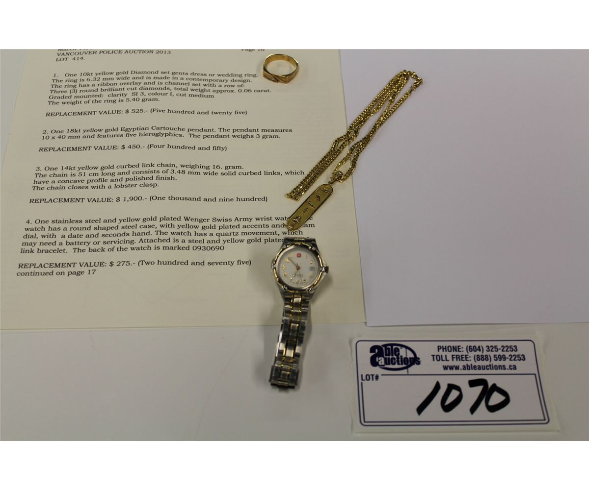 ONE 10KT YELLOW GOLD DIAMOND SET GENTS DRESS RING REPLACEMENT VALUE $525, ONE 18KT YELLOW GOLD EGYPTIAN CARTOUCHE PENDANT REPLACEMENT VALUE $450, ONE 14KT YELLOW GOLD CURBED LINK CHAIN WIGHING 16 GRAMS REPLACEMENT VALUE $1900, ONE STAINLESS STEEL WENGER SWISS ARMY WATCH REPLACEMENT VALUE $275