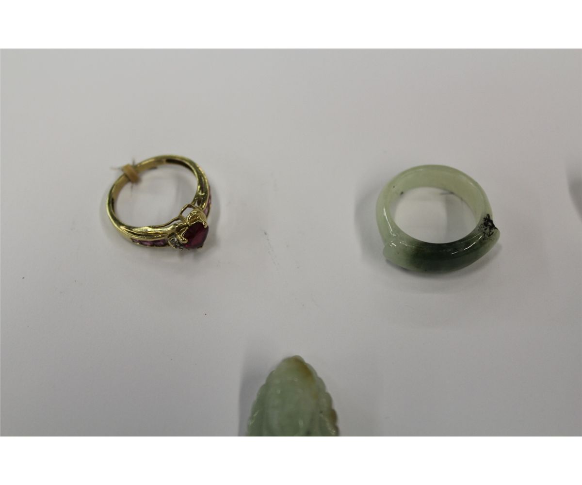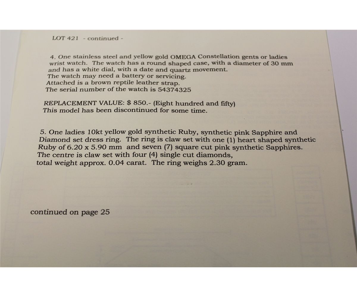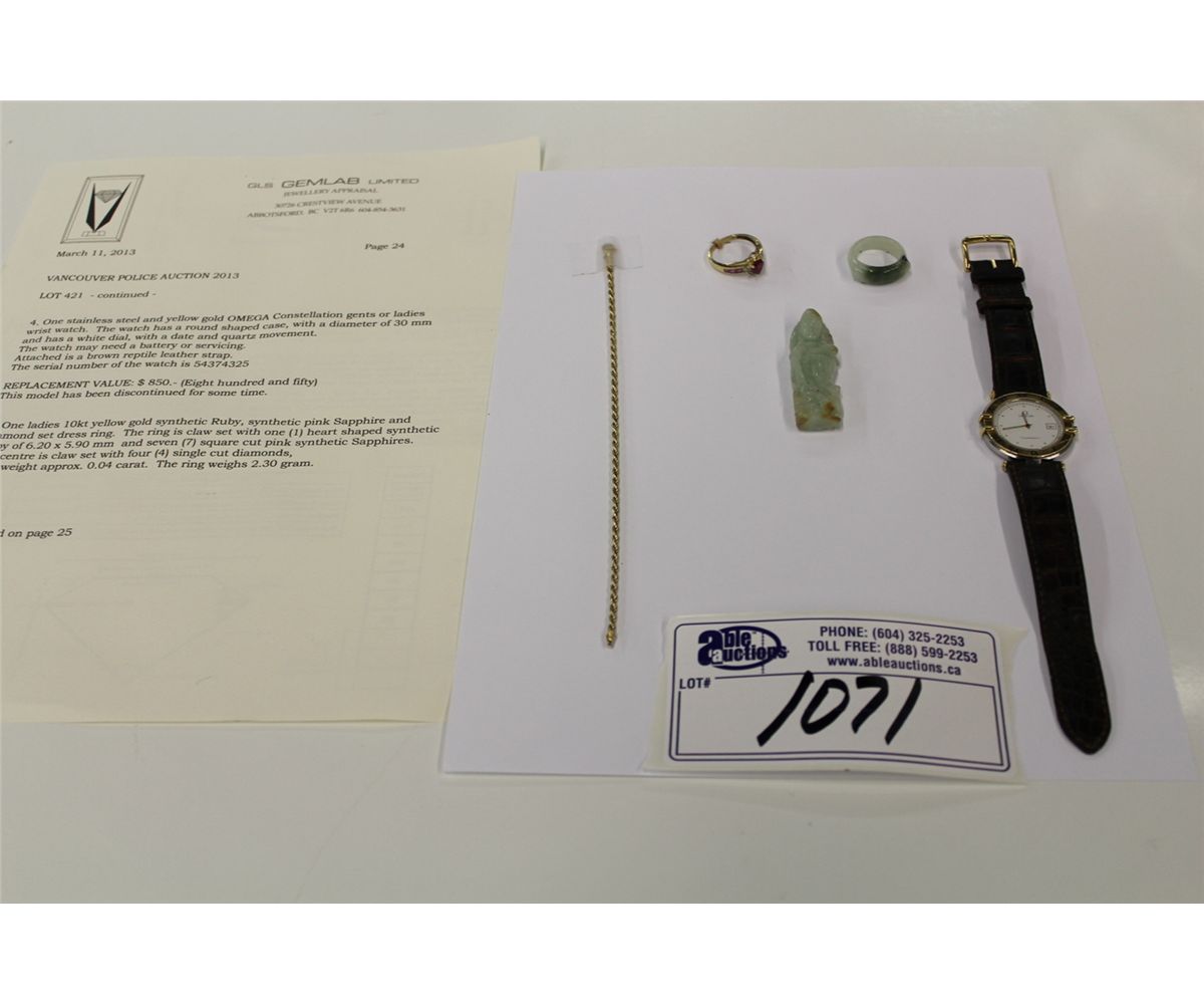 ONE 10KT YELLOW GOLD DIAMOND SET GENTS DRESS RING REPLACEMENT VALUE $525, ONE 18KT YELLOW GOLD ONE KUAN YIN BURMESE JADEITE FIGURE, ONEN BURMESES JADEITE SADDLE RING, ONE 10KT YELLOW GOLD FACETED ROPE STYLE BRACELET REPLACEMENT VALUE $275 ONE STAINLESS STEEL AND YELLOW GOLD OMEGA CONSTELLATION WRIST WATCH REPLACEMENT VALUE $850 AND ONE LADIES10KT YELLOW GOLD SYNTHETIC RUBY RING INCLUDES PROFESSIONAL APPRAISAL