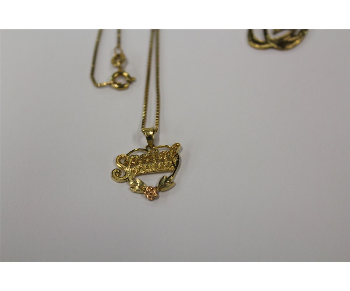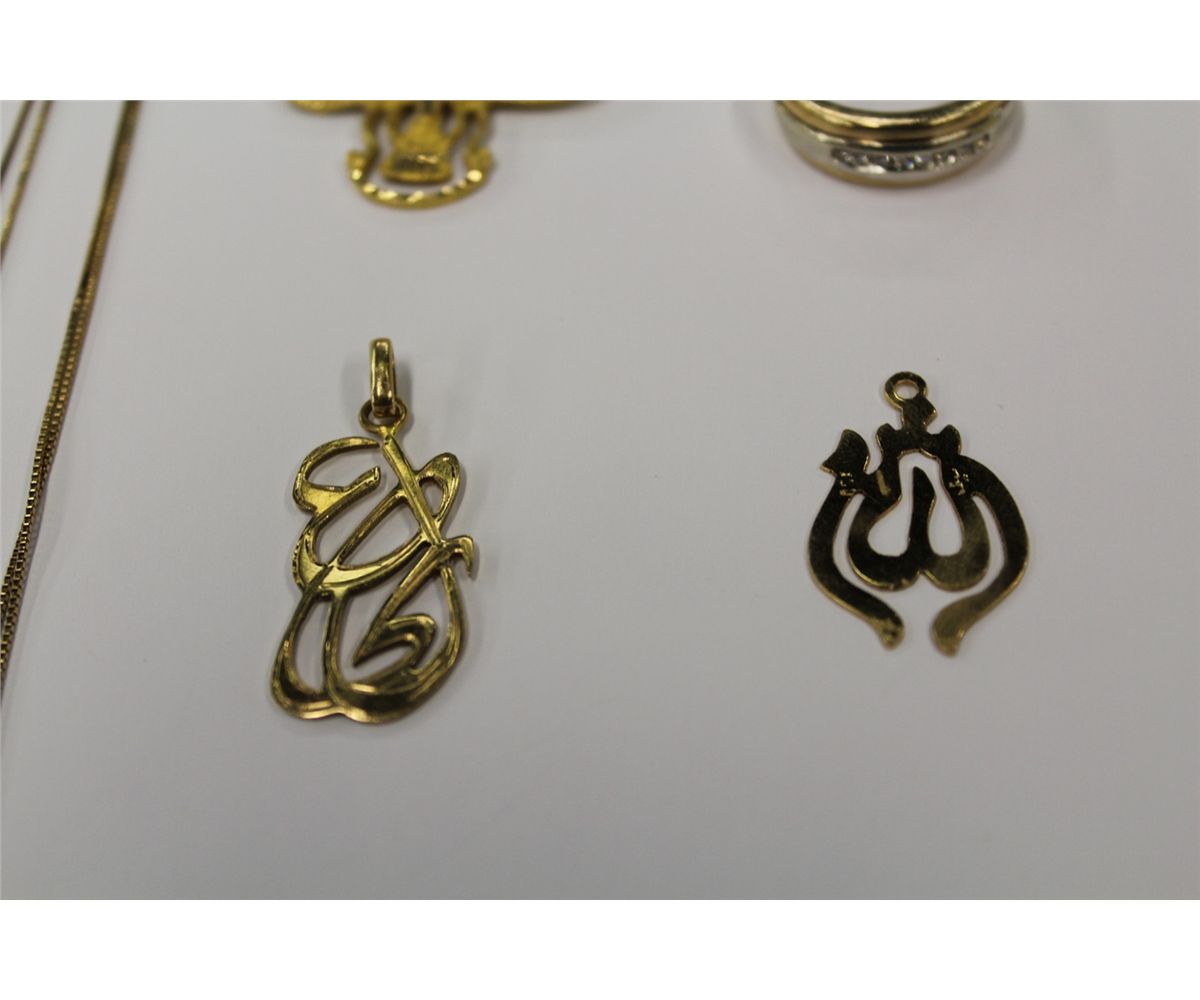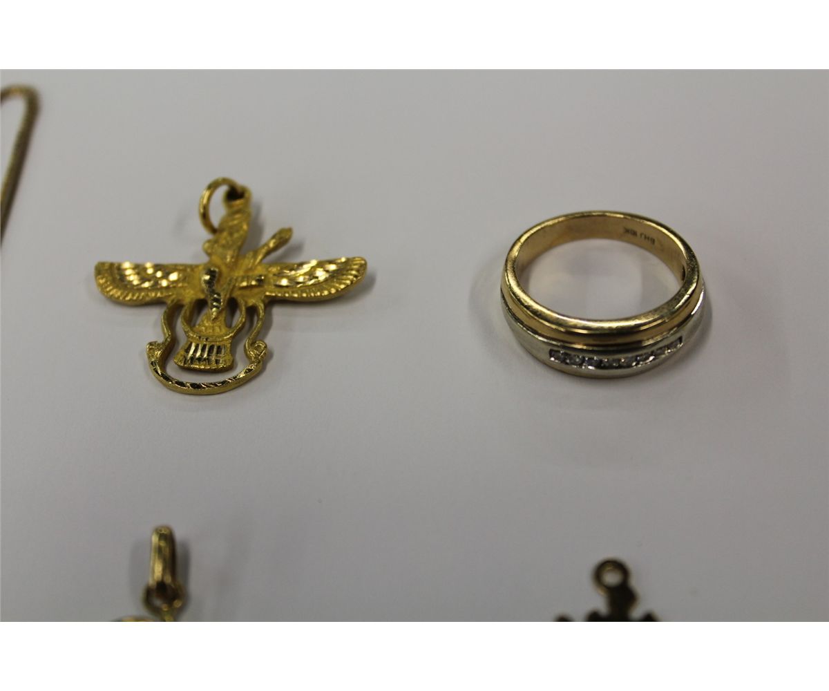 ONE 10KT YELLOW GOLD DIAMOND SET GENTS WEDDING RING REPLACEMENT VALUE $900, ONE 18KT YELLOW GOLD INCAN STYLE PENDANT. REPLACEMENT VALUE $825,  TWO (2) 18KT YELLOW GOLD PIERCED AND HAND SEWN PENDANTS REPLACEMENT VALUE $600, ONE 10KT YELLOW GOLD BOX LINK CHAIN AND PENDANT