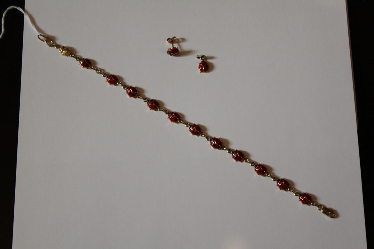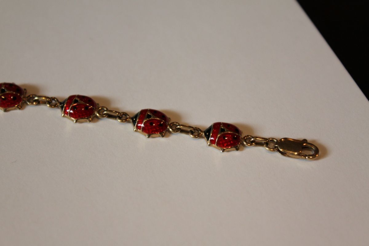 The bracelet consists of oval shaped red and black enameled lady bug links of