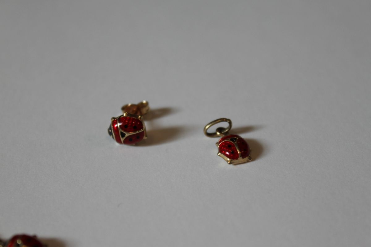 One (1) only 10kt yellow gold red ad black enameled Lady Bug earring,