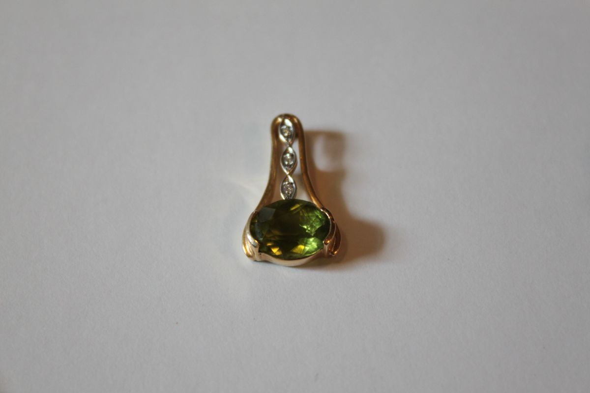 One 14kt yellow gold and rhodium finish imitation Peridot and Diamond set pendant.  The pendant is made in a tapered design and measures 20 x 10 mm.  The pendant is semi bezel set with: