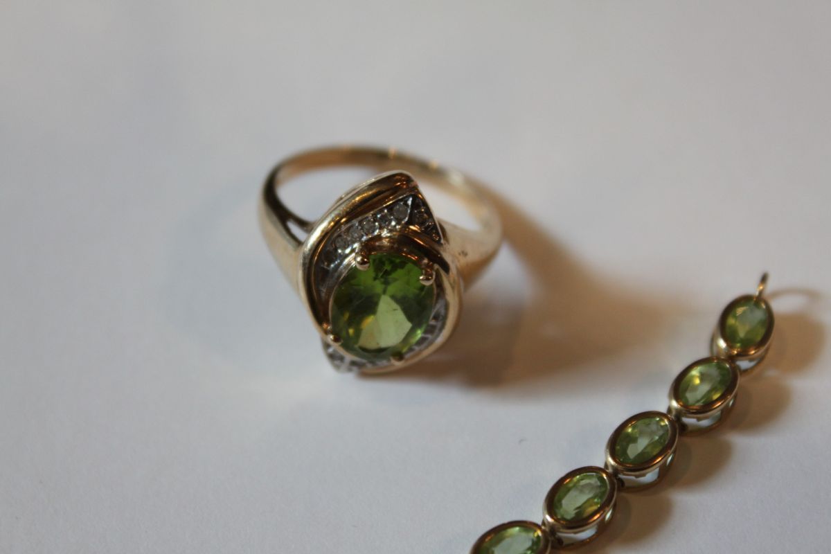 One ladies 10kt yellow gold and rhodium finish natural Peridot and Diamond set dress ring.  The ring is made in a bold marquise shaped design of 20 x 14 mm
