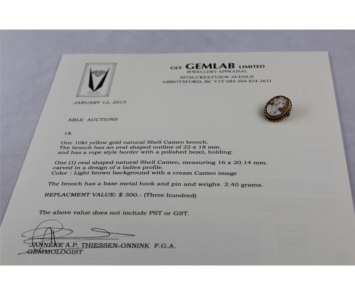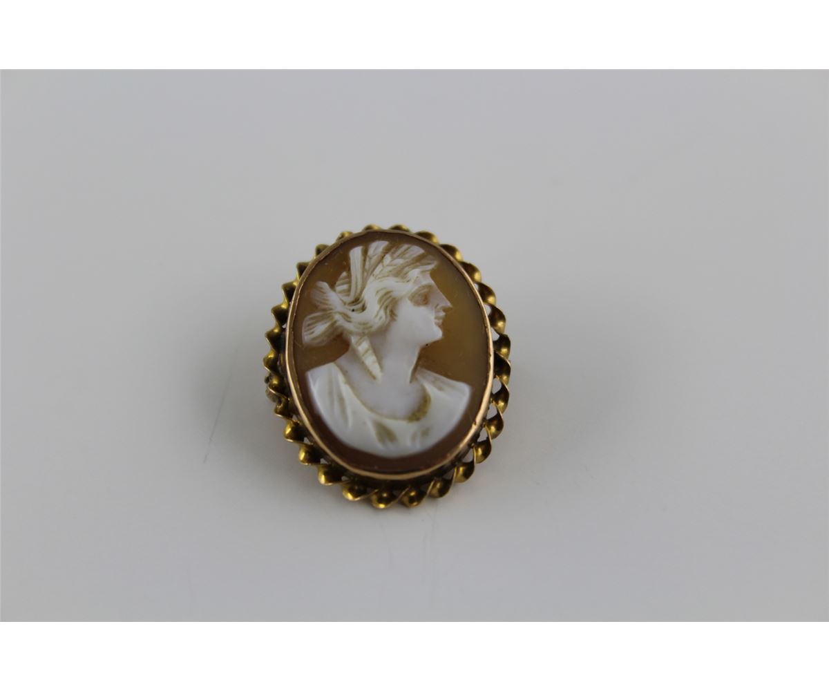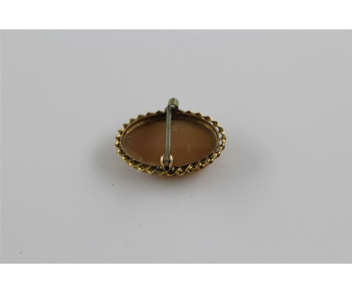 ONE 10KT YELLOW GOLD NATURAL SHELL CAMEO BROOCH CARVED IN A DESIGN OF A LADIES PROFILE. REPLACEMENT VALUE: $300.00