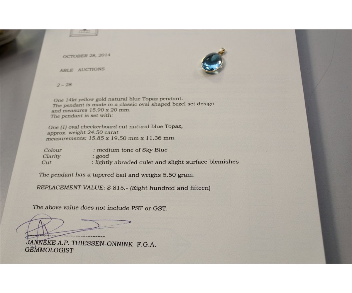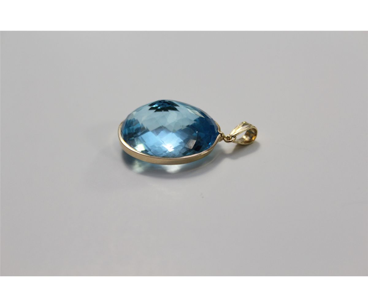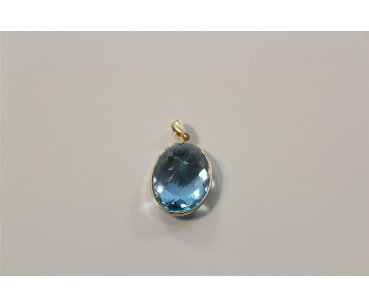 ONE 14 KT YELLOW GOLD NATURAL BLUE TOPAZ PENDANT SET WITH 1 OVAL CHECKBOARD CUT NATURAL BLUE TOPAZ APPROX. 24.50 CARATS. REPLACEMENT VALUE 815