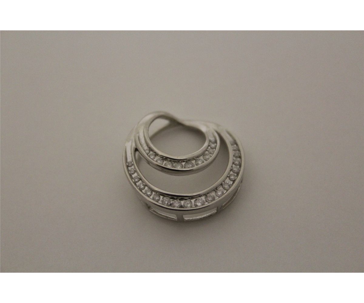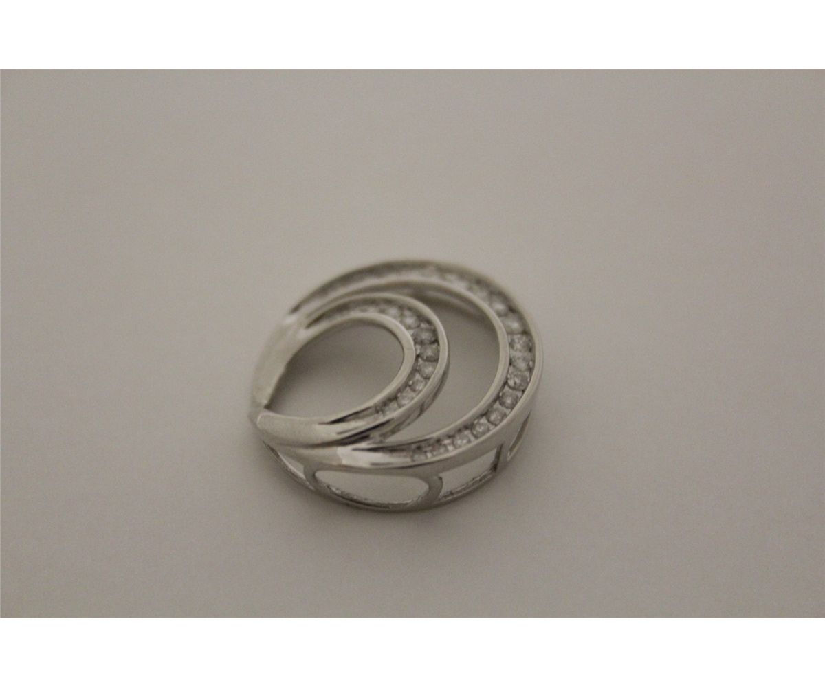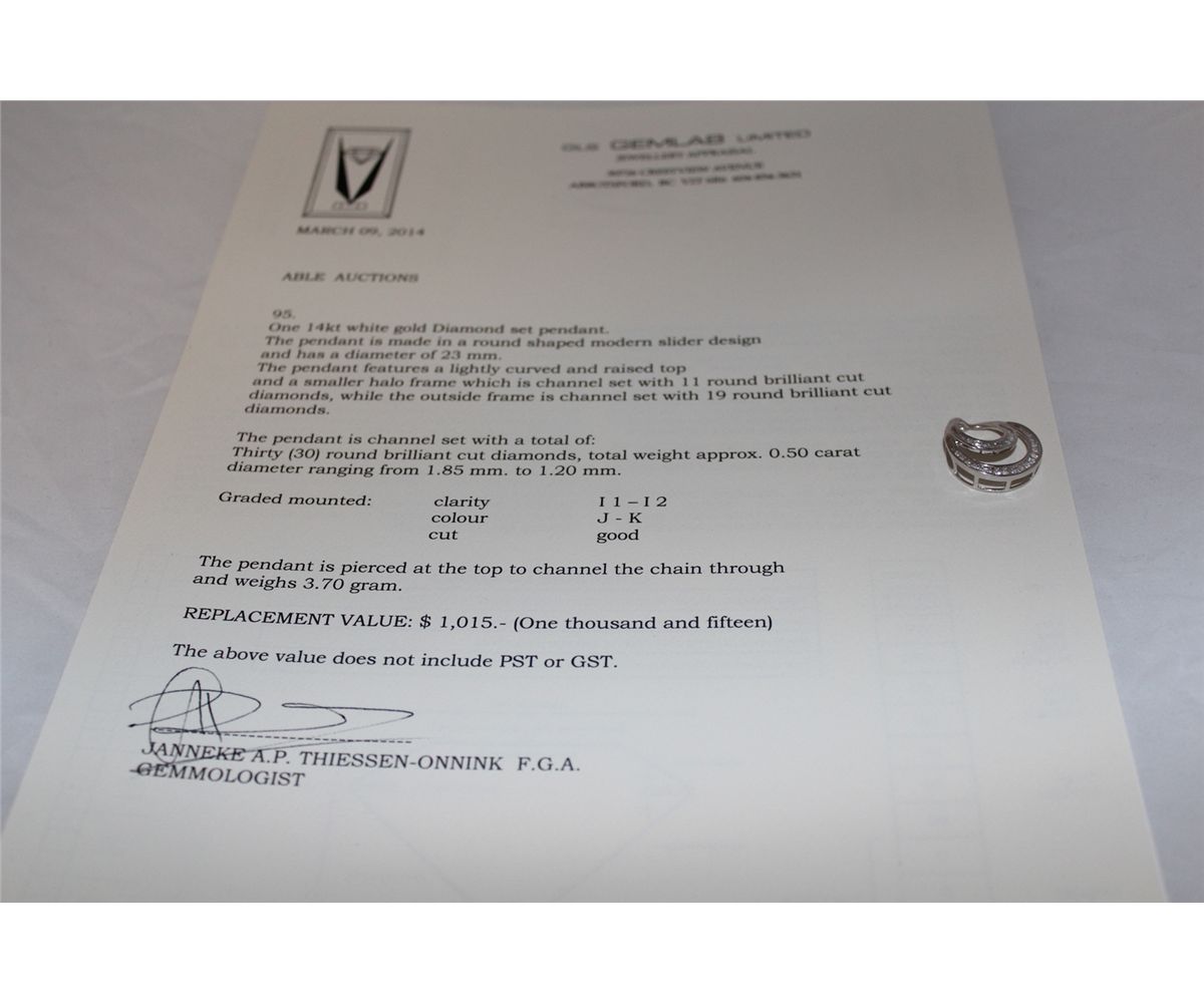 ONE 14KT WHITE GOLD DIAMOND SET PENDANT. ROUND SHAPED MODERN SLIDER DESIGN. DIAMETER 23MM 30 ROND BRILLIANT CUT DIAMONDS TOTAL WEIGHT APPROX 0.50 CARAT DIAMETER RANGING FROM 1.85MM TO 1.20MM REPLACEMENT VALUE $1,015.00