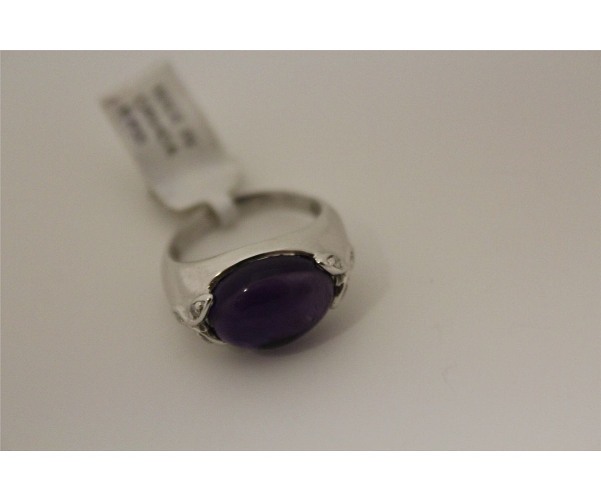 ONE 14KT WHITE GOLD NATURAL AMETHYST AND DIAMOND SET LADIES DRESS RING. SET WITH 6 ROUND BRILLIANT CUT DIAMONDS 0.09 CARAT AND 1 OVAL CABOCHON CUT NATURAL AMETHYST. WEIGHS 5.80 GRAM, MARKED 585 INCL. GEMMOLOGIST APPRAISAL $885