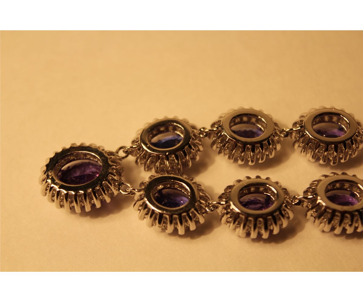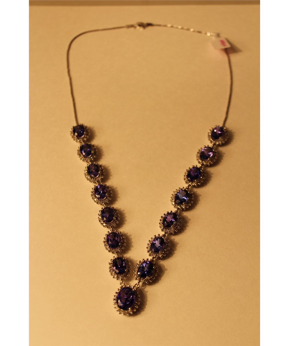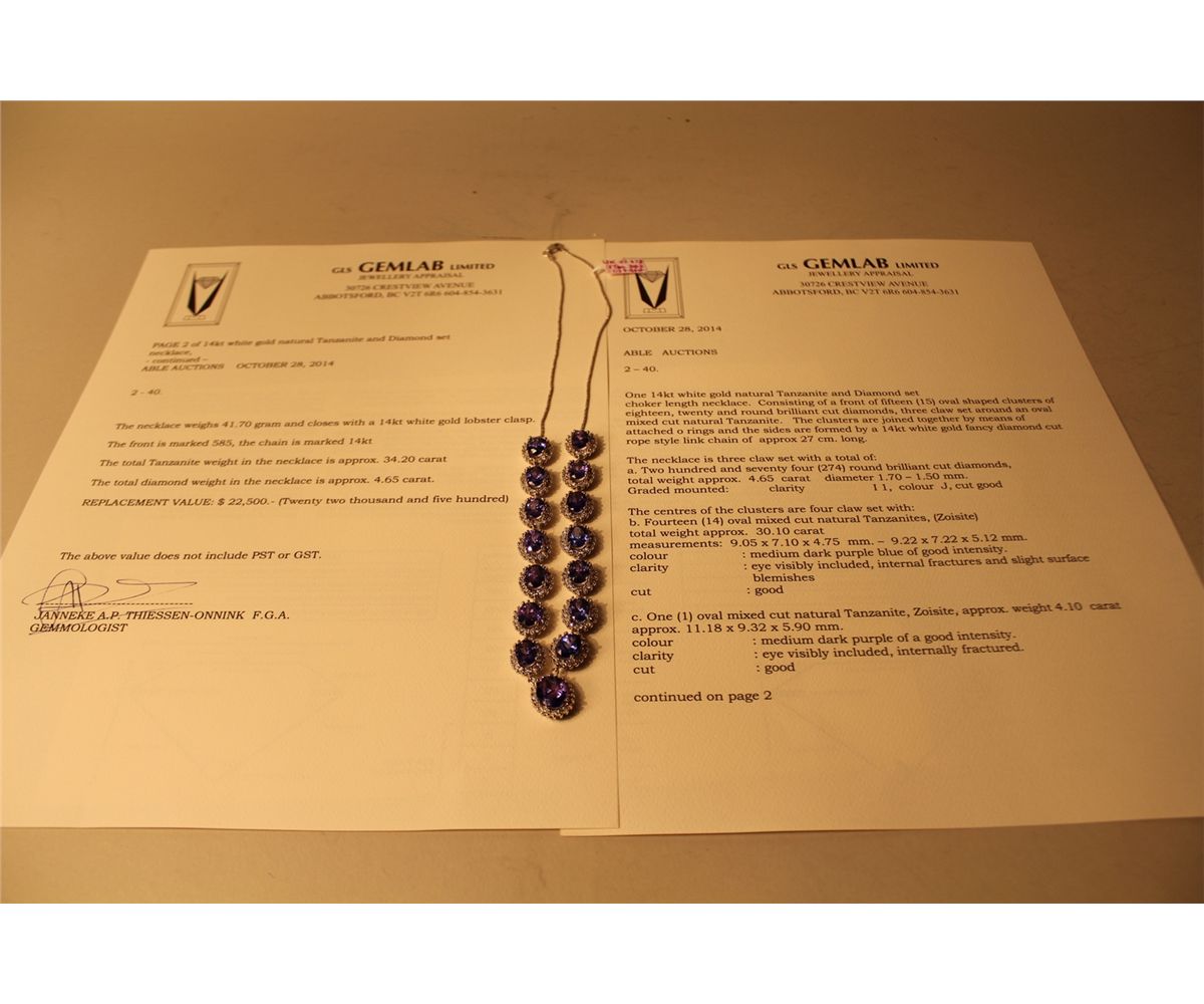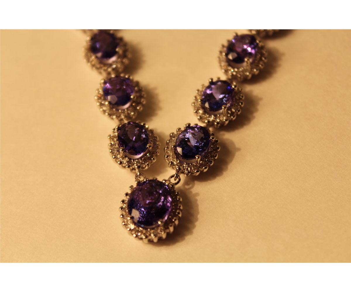 ONE 14KT WHITE GOLD NATURAL TANZANITE AND DIAMOND SET CHOKER NECKLACE. CLAW SET WITH 274 ROUND BRILLIANT CUT DIAMONDS APPROX. 4.65 CARATS AND 14 OVAL MIXED CUT NATURAL TANZANITES APPROX. 30.10 CARATS, ONE OVAL MIXED CUT NATURAL TANZANITE APPROX. 4.10 CARATS. REPLACEMENT VALUE: $22500.00