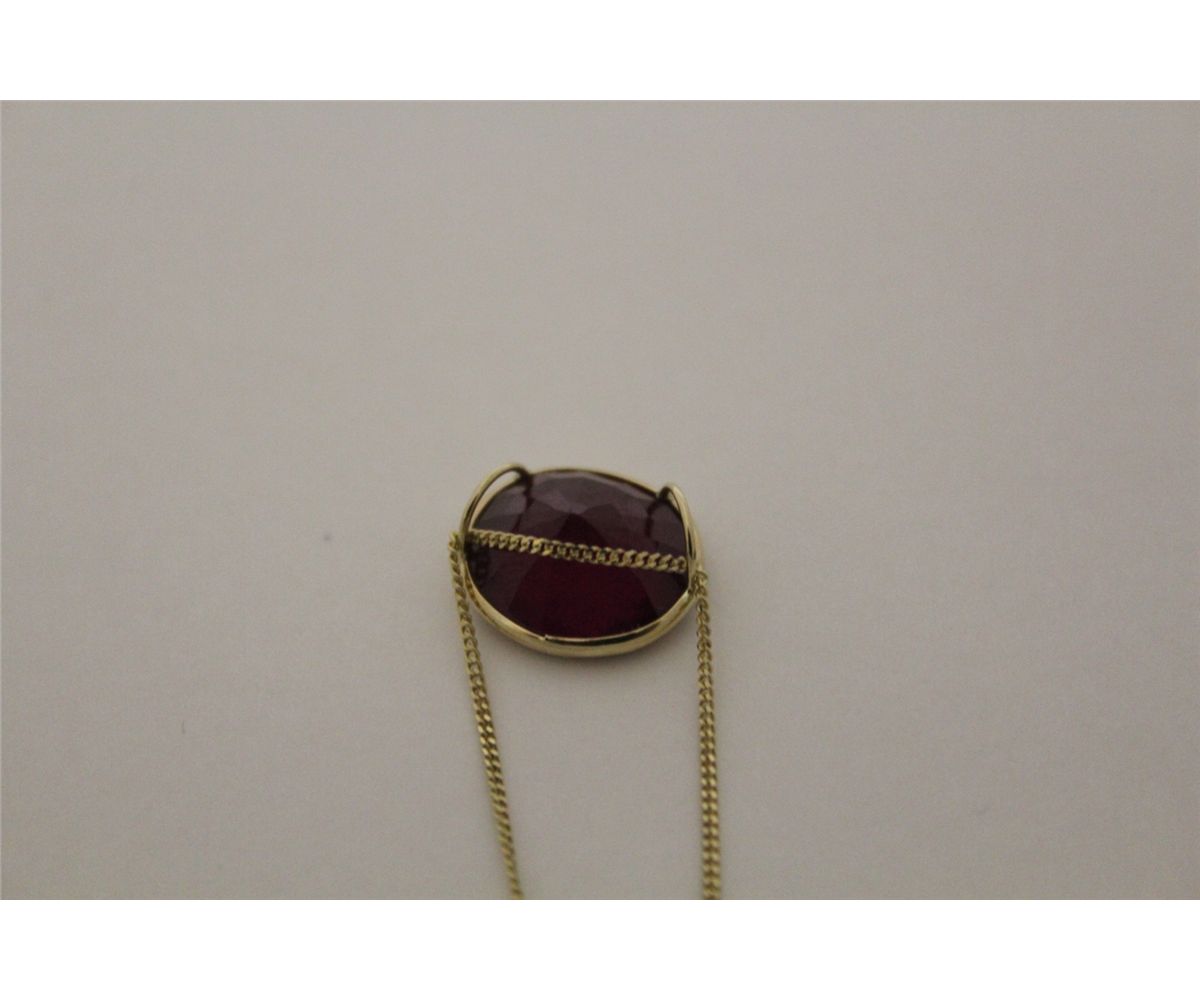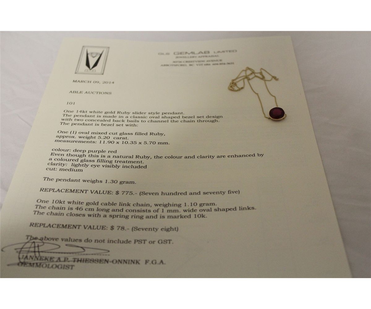 ONE 14KT WHITE GOLD RUBY SLIDER STYLE PENDANT. CLASSIC OVAL SHAPED BEZEL SET DESIGN. ONE OVAL MIXED CUT GLASS FILLED RUBY. APPROX WEIGHT 5.20 CARAT. PENDANT WEIGHS 1.30 GRAMS REPLACEMENT VALUE $775.00 ONE 10KT WHITE GOLD CHAIN 1.10GRAMS REPLACEMENT VALUE $78.00