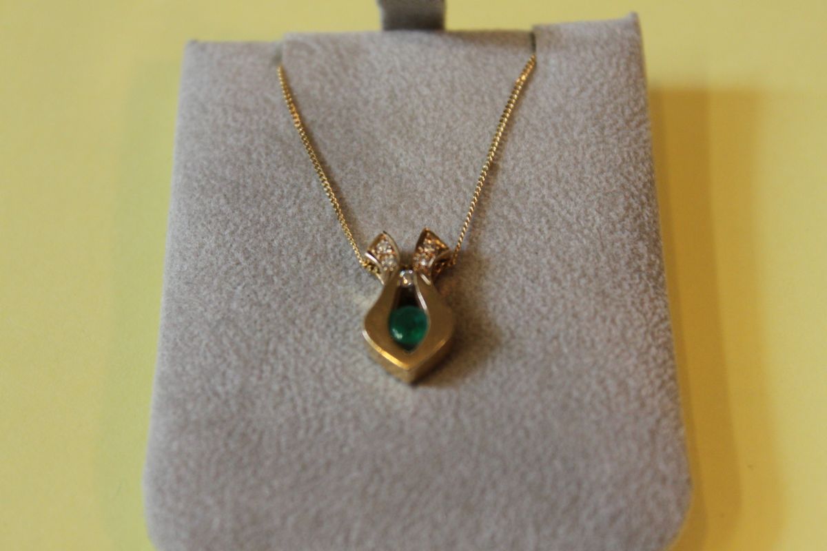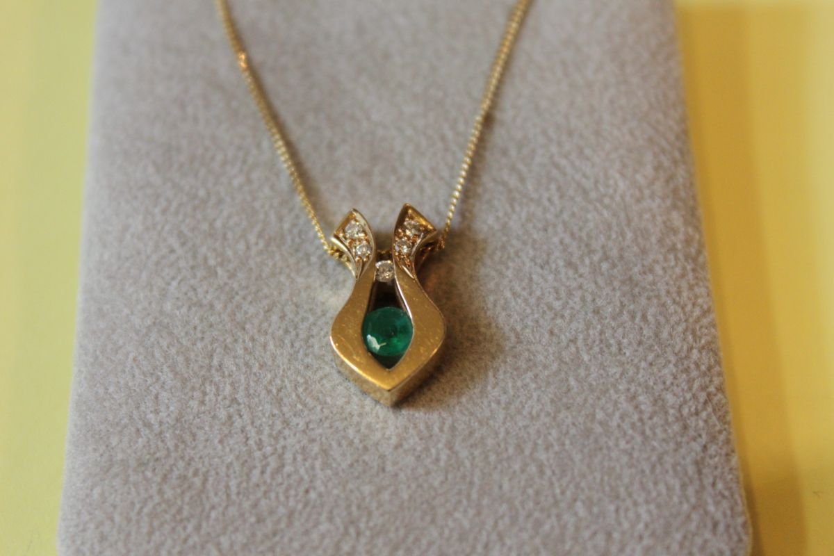 One 14kt yellow gold custom made natural Emerald and Diamond set pendant. The pendant is made in a contemporary marquise shaped and flared design of  18  x 9.70 mm.  The flared top of the pendant is pierced to channel the chain through and is pave set with: