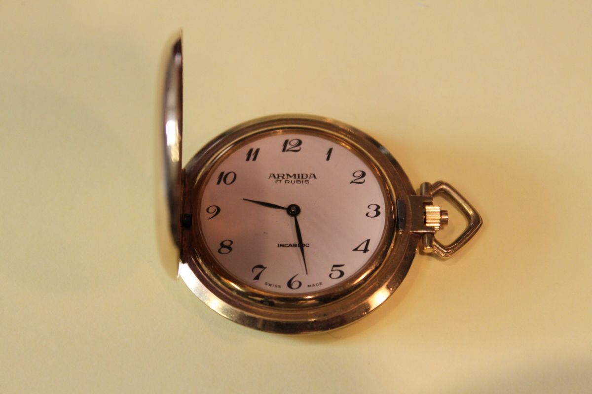 One yellow gold plated gents pocket watch.  ARMIDA.