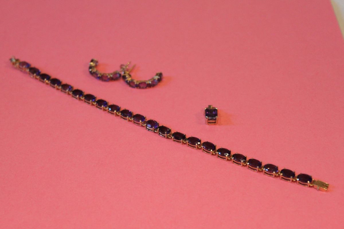 ONE 14KT YELLOW GOLD NATURAL AMETHYST TENNISH STYLE BRACELET - AV $775, ONE 10KT YELLOW GOLD AMETHYST & DIAMOND PENDANT - AV $250, ONE PAIR OF 10KT YELLOW GOLD CURVED SEMI HOOP STYLE AMETHYST EARRINGS - AV $275, 2 PAIR 14KT AMETHYST