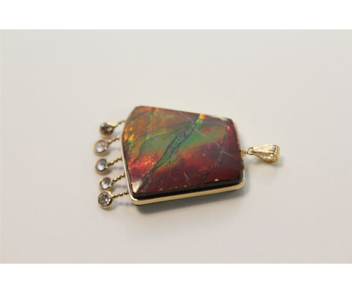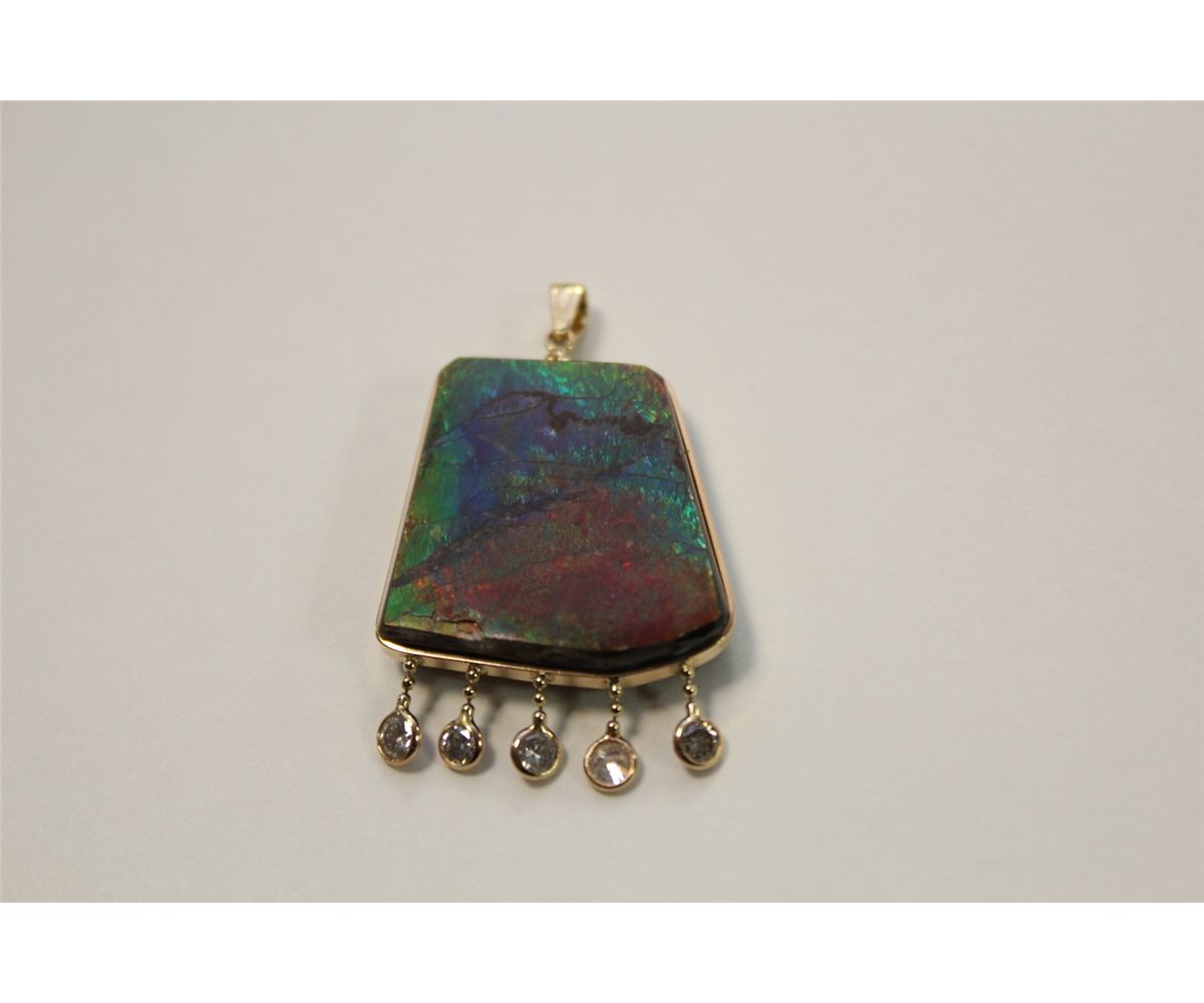 ONE 14KT YELLOW GOLD NATURAL AMMOLITE AND DIAMOND SET PENDANT BEZEL SET WITH 1 CUSHION SHAPED NATURAL AMMOLITE AND 5 ROUND BRILLIANT CUT DIAMONDS APPROX. 0.50 CARATS. REPLACEMENT VALUE: $1600.00