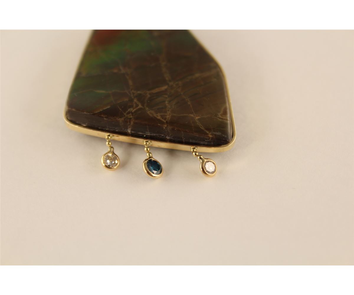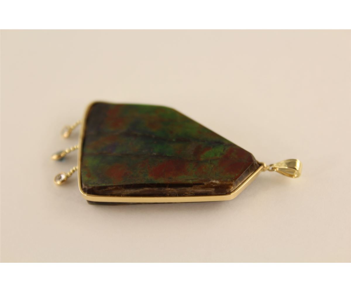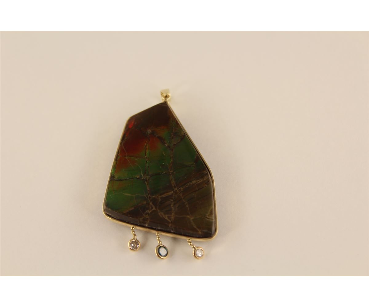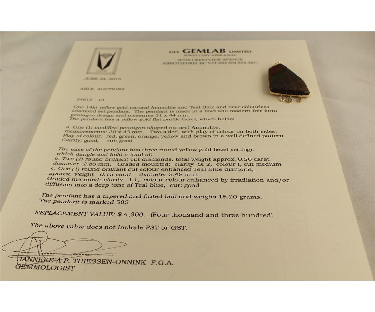 ONE 14KT YELLOW GOLD NATURAL AMMOLITE & DIAMOND SET PENDANT.  BEZEL HOLDS 1 MODIFIED  PENTAGON SHAPED NATURAL AMMOLITE, 2 ROUND BRILLIANT CUT DIAMONDS APPROX. 0.20 CARATS & 1 ROUND BRILLIANT CUT  COLOUR ENHANCED TEAL BLUE DIAMOND APPROX. 0.15 CARATS.  REPLACEMENT VALUE:$4300.00