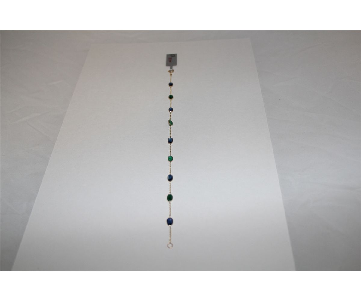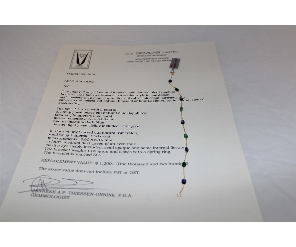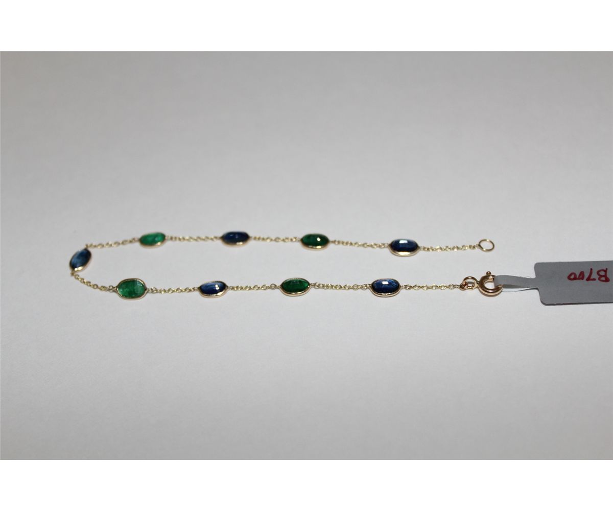 ONE 14KT YELLOW GOLD NATURAL EMERAL AND NATURAL BLUE SAPPHIRE BRACELET. STATION STYLE INL LINE DESIGN AND CONSISTS OF 12MM CHAIN LINK. 5 OVAL BLUE SAPPHIRES. APPROX WEIGHT 2.25CARAT. 4 OVAL EMERALDS APPROX WEIGHT 1.50CARAT REPLACEMENT VALUE $1,200.00