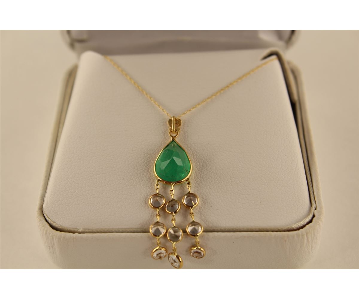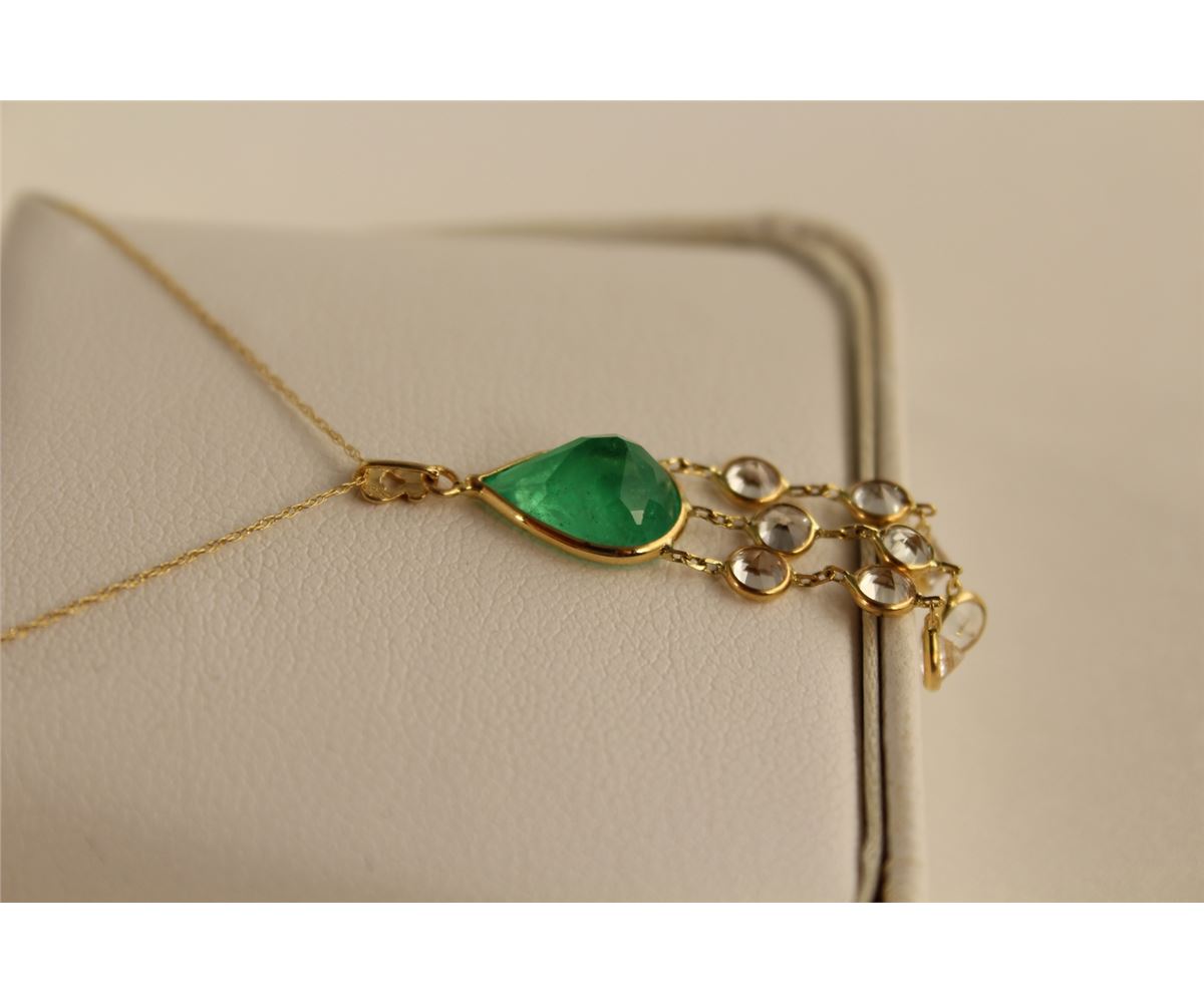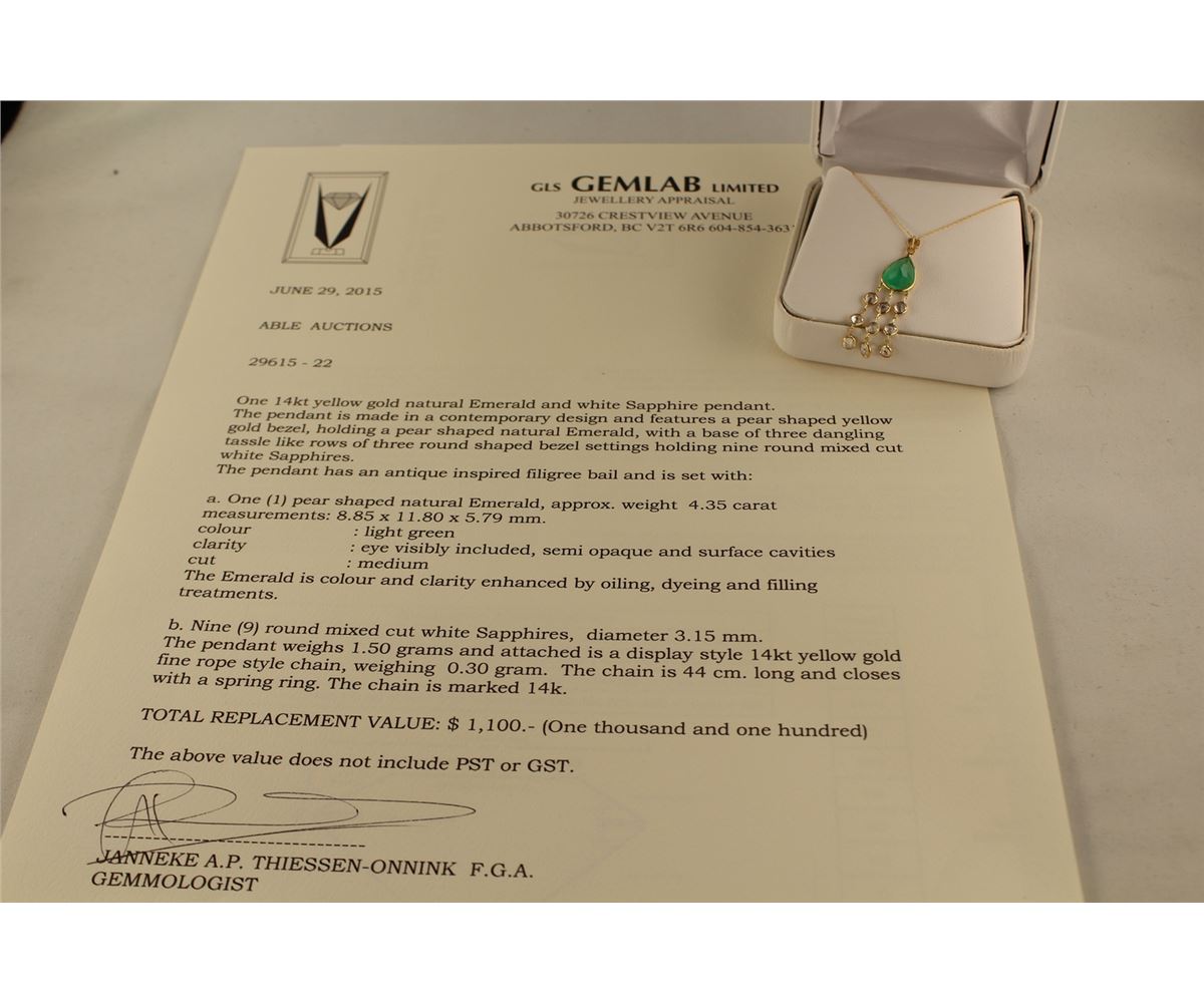 ONE 14KT YELLOW GOLD NATURAL EMERALD AND WHITE SAPPHIRE PENDANT. SET WITH ONE PEAR SHAPED EMERALD 4.35CT AND 9 ROUND MIXED CUT SAPPHIRES. REPLACEMENT VALUE $1100