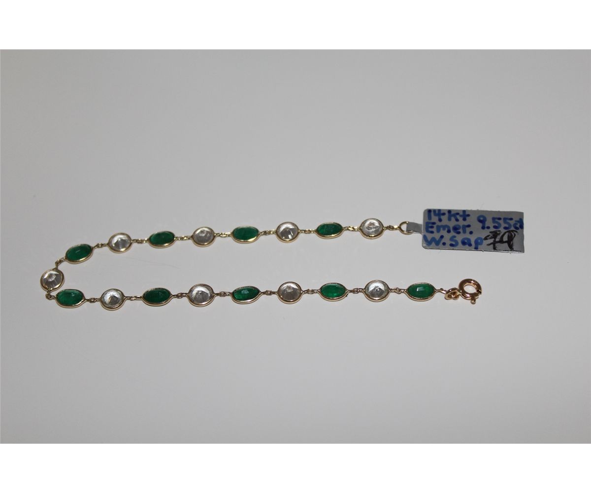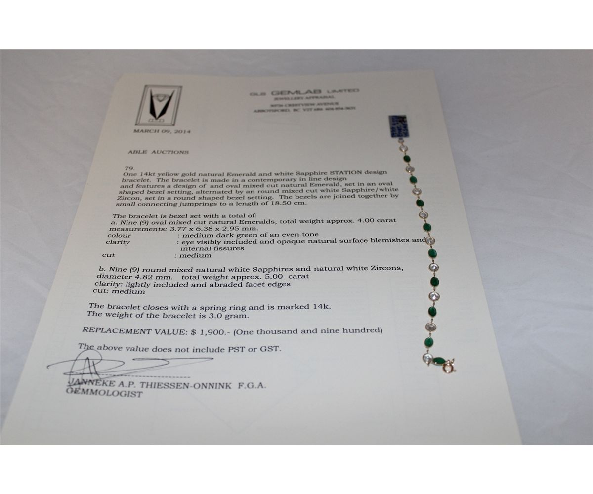 ONE 14KT YELLOW GOLD NATURAL EMERALD AND WHITE SAPPHIRE STATION DESIGN BRACLET. 9 OVAL EMERALDS TOTAL WEIGHT APPROX 4.00CARAT, MEASUREMENTS:3.77X6.38X2.95MM COLOUR: MEDIUM DARK GREEN, CUT: MEDIUM WEIGHT OF BRACELET IS 3.0GRAMS REPLACEMENT VALUE $1,900.00