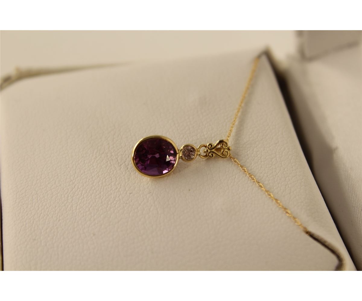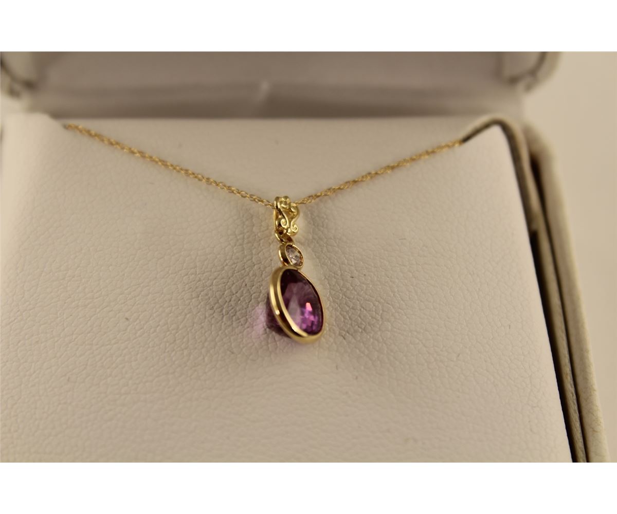 ONE 14KT YELLOW GOLD NATURAL PURPLE SAPPHIRE AND DIAMOND SET PENDANT. SET WITH ONE OVAL MIXED CUT NATURAL PURPLE SAPPHIRE APPROX. 2.00CT AND ONE ROUND BRILLIANT CUT DIAMOND 0.06CT REPLACEMENT VALUE $1300